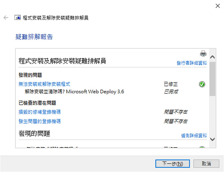 首頁電腦軟體系統應用 使用 Microsoft Program Install and Uninstall 解決程式無法安裝或移除問題 一般我們使用 Windows 安裝程式較少會碰到問題,而較常碰到的問題就是要解除安裝某個應用程式,尤其是已安裝有段時間的應用程式,即便是該功能被列在設定 > 程式和功能的視窗中,按下[ 解除安裝/變更 ]依然會有錯誤發生而無法順利解除安裝,碰到這種情形,也許可以用 Microsoft Program Install and Uninstall 這個微軟官方推出的免費工具來試試,該工具免安裝,支援 Windows 10、8、8.1、7。 🔔 不錯過任何精彩! 立即訂閱我們的 LINE 官方帳號 每次發佈新文章時,您將會第一時間收到本站文章連結通知,輕鬆掌握最新資訊! 使用 LINE 追蹤文章更新 §相關文章,還可以參閱:CatLock:可鎖定鍵盤的 Windows 應用程式,防止寵物意外觸碰Zen Ad blocker 瀏覽器與應用程式均適用的廣告攔截器,免費且開放原始碼TimVer 一站式顯示 Windows 版本及電腦硬體相關訊息的工具「微軟電腦管家」內含開機啟動項目管理、儲存空間最佳化等免費工具 全方位提升電腦效能Windows Startup Timer 測量 Windows 從開機到完全啟動所需時間 主要可以協助修正以下問題: 64 位元作業系統上損毀的登錄機碼。 控制更新資料的損毀登錄機碼。 防止安裝新程式。 防止完全解除安裝或更新現有程式。 阻止您在 [控制台] 中透過 [新增或移除程式] (或 [程式和功能]) 解除安裝程式。 如何使用 Microsoft Program Install and Uninstall 解除所安裝的應用程式? 1.該工具程式免安裝,下載後,滑鼠直接雙擊便可開啟。 2.按[ 下一步 ],便會開始偵測問題。 3.偵測完成便會有[ 正在安裝 ]還是[ 正在解除安裝 ]的對話視窗出現,我們以[ 正在解除安裝 ]為例。 4.按[ 正在解除安裝 ]後,便會開始掃描 Windows 系統已按裝的應用程式。 5.選擇想解除又無法解除的應用程式。 6.可試著修復或嘗試解除安裝。 7.如果顯示的是已修正的訊息,即代表成功修復了此問題。 8.檢視詳細資訊,還可以讓我們檢視系統所安裝應用程式的相關問題。 Microsoft Program Install and Uninstall語言:英文適用:Windows官方網站:https://support.microsoft.com/zh-tw/help/17588/windows-fix-problems-that-block-programs-being-installed-or-removed下載:按我下載