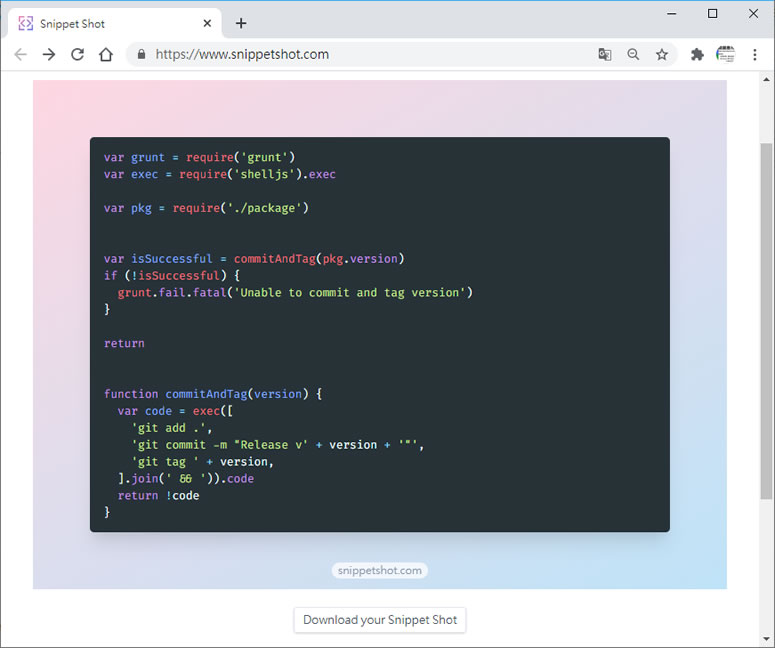 首頁線上工具生產力工具 Snippet Shot 程式碼美化與擷圖免費線上工具 寫的程式碼如果需要請遠端的人協助,很多人乾脆就是拿起手機對螢幕所顯示的程式碼拍照就傳過去了,程式碼短又清晰還可以,如果相反,來來回回幾次,反而事倍功半,Snippet Shot 是個可將貼上的程式碼進行顏色落差美化,並產生 PNG 或 SVG 圖檔的免費線上服務,內建有多種程式語言的美化樣式,如果不滿意還可自行定義,該服務免註冊立即可用,產生的圖片檔也不會有該網站的相關浮水印。 🔔 不錯過任何精彩! 立即訂閱我們的 LINE 官方帳號 每次發佈新文章時,您將會第一時間收到本站文章連結通知,輕鬆掌握最新資訊! 使用 LINE 追蹤文章更新 §相關文章,還可以參閱:Google AI Plus 降到 260 元對決 ChatGPT Go!誰的功能更值得訂閱?ChatGPT Go 月付 290 元值得嗎?免費版、Plus 完整比較用 AI 做出的電影,YouTube 就看得到!一起來欣賞這部贏得百萬美元的突尼西亞短片《Lily》Apple Creator Studio 來了:Final Cut Pro、Logic Pro 等九款 App 月付 390 元,學生優惠僅 90 元ChatGPT 智慧購物功能登台!台灣用戶也能用 AI 做商品研究與比價 如何使用 Snippet Shot? 1.使用瀏覽器進入 Snippet Shot 網站,貼上程式碼,就立即可以看到利用顏色做出的反差美化。 2.內建多種程式語言美化樣式。 3.File format 提供 PNG 與 SVG 圖檔格式供用戶自行選擇。 4.完成後點擊[ Download your Snippet Shot ]就可以下載。 Snippet Shot網站網址:https://www.snippetshot.com/