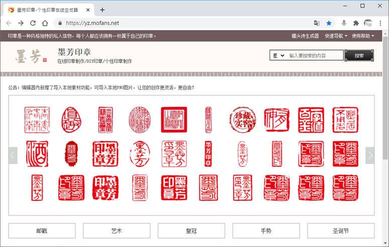 首頁免費素材圖像圖示 「墨芳」免費線上印章產生器 實體的印章可以到街上的刻印配鎖行利用電腦來刻,而一顆木頭印章也僅需要幾分鐘就可以製作完成,但想在電腦內做出一顆印章的圖案,那可能就需要有些編輯圖案的背景,才有辦法製作,所幸,網路上有很多免費的印章產生器,像是「墨芳」印章產生器,使用者只需要輸入要產生的名字或文字,選好樣式、顏色及字體,立刻就可以產生出美美的印章圖案,讓你放到哪裡都合適。 🔔 不錯過任何精彩! 立即訂閱我們的 LINE 官方帳號 每次發佈新文章時,您將會第一時間收到本站文章連結通知,輕鬆掌握最新資訊! 使用 LINE 追蹤文章更新 §相關文章,還可以參閱:精心打造的等距美學:Isocons 免費圖示資源庫,CC BY 4.0 授權Map-It:日本地圖素材的免費寶庫,從全國到市町村一網打盡PICaboo! 日系可愛免費向量圖素材庫:設計師必收的創作寶庫GAHAG:日本免費圖庫新選擇,結合アハ體驗互動遊戲的創意素材平台illust STAMPO:日式風格的免費插圖素材網站 如何使用 「墨芳」產生器? 1.使用瀏覽器進入 「墨芳」 網站,除了提供印章的樣式外,還包含有郵戳、藝術、皇冠、手勢及聖誕節的圖章樣式。 2.點擊所需要的樣式,便可以進入編輯頁面,選取要替換的文字後,在右側的編輯文字框中的文字輸入文字,就可以反映的印章中。 3.也可以用導入素材,加入圖片。 4.完成後,按[ 下載圖片 ],按說明操作,就可以取得 PNG 圖檔。 墨芳網站網址:https://yz.mofans.net/