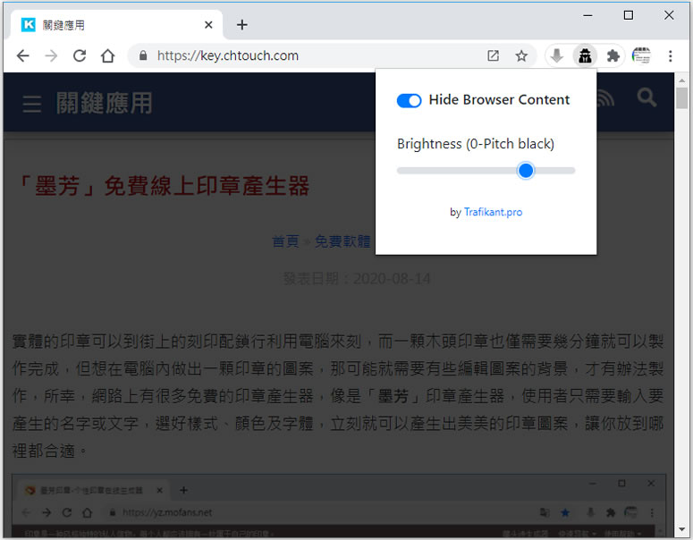 首頁瀏覽器擴充功能網頁瀏覽 Pitch Black 滑鼠移開就將瀏覽器內容隱藏 - Chrome 瀏覽器擴充功能 要瀏覽有隱私內容或是瀏覽該時段不適合瀏覽的網頁時,通常都希望能在有人要發現之前,能夠快速的將瀏覽內容隱藏起來,而不論是按瀏覽器的最小化按鈕或是用已開的應用程式來掩蓋,這些動作都需要滑鼠的游標來對準按鈕,不符合慌張且極短時間就能準確辦到的條件,Pitch Black 是個免費的 Chrome 瀏覽器擴充功能,其提供當滑鼠游標一離開網頁內容時,就將網頁內容變黑(透明度可調整),比起需要有精確動作的輔助才能隱藏,Pitch Black 絕對符合大家的需要。 🔔 不錯過任何精彩! 立即訂閱我們的 LINE 官方帳號 每次發佈新文章時,您將會第一時間收到本站文章連結通知,輕鬆掌握最新資訊! 使用 LINE 追蹤文章更新 §相關文章,還可以參閱:Font Finder & Style Detector 網頁字型搜尋與樣式偵測器,免費瀏覽器擴充功能MarkX 將網頁所選文字內容儲存成書籤,提供關鍵字搜尋功能U-Eyes 移動設備瀏覽網站模擬器,可擷取網頁成圖片與錄製螢幕Live CSS Tester 在任何網頁注入 CSS 進行即時測試Quick History 以網站角度快速檢視該網站的瀏覽紀錄(瀏覽器擴充功能) 如何安裝及使用 Pitch Black? 1.使用 Chrome 瀏覽器到達 Pitch Black 安裝網址後,按[ 加 CHROME ]便會開始引導用戶進行下載與安裝。 2.安裝完成後,瀏覽器的右上角會出現提示與擴充功能的圖示按鈕。 3.點擊 Pitch Black 按鈕,就可以來啟用隱藏功能,如果是已開啟的分頁,需要做重取網頁的動作,新開啟的分頁會直接套用,當滑鼠游標一離開內容區域時,例如在分頁標籤上,就會啟用隱藏。 4.所謂的隱藏就是將內容頁面變成全黑,也可以滑鼠拖動 Brightness 值,調整透明度。 Pitch Black性質:免費官方網站:https://chrome.google.com/webstore/detail/pitch-black-hide-browser/hkghdpialafoejaglhifhlahialablmb/related