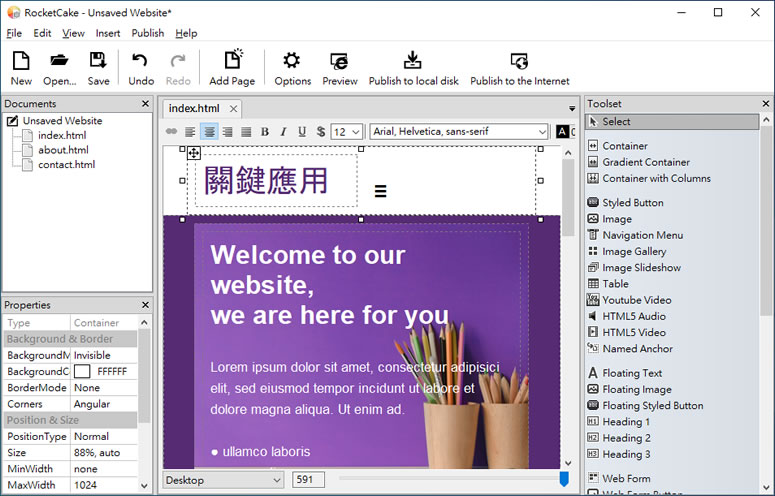 首頁電腦軟體開發工具 RocketCake 免費回應式網頁編輯器 為了解決同一個網頁能在不同的螢幕解析度下,仍可以有適合的呈現大小與內容,因此,網頁設計時就會採用 Responsive web design 的技術,這樣的作法不但可讓使用者獲得良好的閱讀體驗,日後網頁的維護也能較為輕鬆。而要設計回應式網頁,網路上有很多的範例可供參考與應用,初學者如果還沒有慣用的網頁編輯器,也可以考慮來使用 RocketCake free responsive website editor 這個可設計回應式網頁的免費編輯器,該應用程式本身就有內建一些網頁模板可供運用,且提供所見即所得的編輯方式,即便是非初學者,也可以使用此方式,取得自己想要的網頁效果。 🔔 不錯過任何精彩! 立即訂閱我們的 LINE 官方帳號 每次發佈新文章時,您將會第一時間收到本站文章連結通知,輕鬆掌握最新資訊! 使用 LINE 追蹤文章更新 §相關文章,還可以參閱:Virtual-C IDE 免費 C語言整合開發環境Cyotek Spriter 自動產出圖片型網頁的 CSS 及 HTML程式碼Pencil 圖形使用者介面(GUI)建立原型免費工具Easy CSS Menu 網頁多層次選單按鈕產生器Hi Slider - JQuery 相片展示產生器 如何使用 RocketCake free responsive website editor ? 1.完成安裝,開啟 RocketCake 後,可選擇內建的模板來練習。 2.設計時,右側面板提供各式各樣的元件,其可以透過左下側的屬性面板,來控制元件的屬性;中間則是網頁的原型。 3.可按 Preview 啟用網頁瀏覽器預覽;如果要看個別元件所產生的 HTML 及 CSS Code,也可以使用滑鼠右鍵的快速功能表來查看。 RocketCake版本:3.5語言:中、英文(多國語言)性質:免費適用:Windows官方網站:https://www.ambiera.com/rocketcake/index.html下載:Windows 按我下載 | MacOS 按我下載