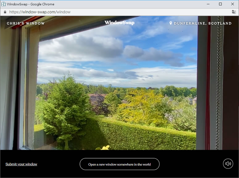 首頁線上工具生活資訊 WindowSwap 在家就能欣賞別人家窗外好風景 新冠病毒防疫期間,不論是在家隔離檢疫還是減少外出旅遊,除了看電視、讀書及聽音樂打發時間之外,不妨來看看別人家的窗戶外頭的好風景,WindowSwap 主要播放由網友們自行錄製的大約 10 分鐘的影片,非即時的直播,使用者進入該平台後,就會隨機找出一個窗戶外景觀,且隨時可切換,如果自家窗外景觀不錯,也可以透過該平台放送自家窗外景象。 🔔 不錯過任何精彩! 立即訂閱我們的 LINE 官方帳號 每次發佈新文章時,您將會第一時間收到本站文章連結通知,輕鬆掌握最新資訊! 使用 LINE 追蹤文章更新 §相關文章,還可以參閱:Apple Music 台灣新用戶優惠:6個月免費暢聽,領取方式與限制一次看!2026春節追劇清單!Netflix 2月必看攻略:燒腦推理、火爆動作片,陪你從初一爽追到開工!459 萬人搶 60 萬份!運動幣中獎號碼公布,快查你的身分證尾數都馬一起GO!LINE GO新年優惠最高拿$800優惠券,還有一個月乘車金等你抽過年搭高鐵自由座要排多久?看LINE就知道 台灣高鐵×LINE TODAY推出春節限定燈號預估服務 如何使用 WindowSwap? 1.使用瀏覽器進入 WindowSwap 網站,點擊[ Open a new window somewhere in the worldarrow ],來隨機播出窗口。 2.右上方會顯示此窗戶景觀的地點,使用者隨時可以透過[ Open a new window somewhere in the worldarrow ]由系統隨機切換窗口。 3.有興趣加入,可點擊[ Submit your window ]來研究如何加入。 WindowSwap網站網址:https://window-swap.com/