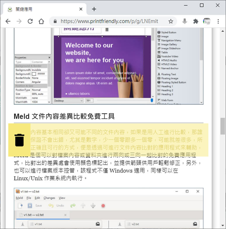 首頁線上工具生產力工具 PrintFriendly 將網頁不想要的內容刪除再轉印成 PDF 不論是使用 Microsoft 的 Edge 瀏覽器,還是 Google 的 Chrome 瀏覽器或是使用可列印成 PDF 檔案的虛擬印表機、總之,要透過應用程式內建的「列印」功能,將數據、報表轉成 PDF 檔案已經是件很簡單的事情了,而轉印的重點在於轉出的 PDF 檔案內容、格式是否可以維持,PrintFriendly 是個可將網頁轉成 PDF 檔案的免費網路服務,與瀏覽器及虛擬印表機的相比轉出的動作並無不同,而其最大差異是在於轉印之前除了將網頁內容重新修正成最適合閱讀的模式,並將內容交由使用者自行編輯,可刪除不想要的內容,進而再轉印出 PDF 檔案。 🔔 不錯過任何精彩! 立即訂閱我們的 LINE 官方帳號 每次發佈新文章時,您將會第一時間收到本站文章連結通知,輕鬆掌握最新資訊! 使用 LINE 追蹤文章更新 §相關文章,還可以參閱:Google AI Plus 降到 260 元對決 ChatGPT Go!誰的功能更值得訂閱?ChatGPT Go 月付 290 元值得嗎?免費版、Plus 完整比較用 AI 做出的電影,YouTube 就看得到!一起來欣賞這部贏得百萬美元的突尼西亞短片《Lily》Apple Creator Studio 來了:Final Cut Pro、Logic Pro 等九款 App 月付 390 元,學生優惠僅 90 元ChatGPT 智慧購物功能登台!台灣用戶也能用 AI 做商品研究與比價 如何使用 PrintFriendly? 1.使用瀏覽器進入 PrintFriendly 網站,就可以將複製好的網址貼到內有 Copy & Paste a URL and Click Preview 字樣的輸入框中後,按[ Preview ]。 2.轉出後,便可使用滑鼠指到欲刪除內容的位置,其左側就會出現個垃圾桶的圖示按鈕,按該按鈕,顏色所標示的區域,便會被刪除。 3.完成後,便可以利用文件上方的 PDF 按鈕來下載 PDF 檔案。 PrintFriendly網站網址:https://www.printfriendly.com/