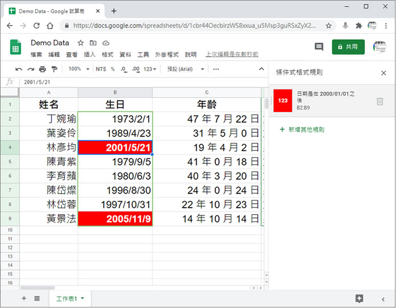 首頁操作技巧Google 試算表 「Google 試算表」如何凸顯表格內特定條件的數據? 如果表格內的數據有很多,對閱讀者來說應該不容易抓到重點,例如要呈現接單價格低於預期價格的業務或是數學成績低於 70分的同學等等,在密密麻麻的數據中,如果可以用顏色凸顯這些數據,這能協助看數據的人,快速掌握重點,對「Google 試算表」來說,我們可以使用[ 條件式格式設定 ]這個功能來完成,透過簡單的公式設定,讓符合的數據以不同的格式來呈現,讓數據更能有視覺化的效果。 🔔 不錯過任何精彩! 立即訂閱我們的 LINE 官方帳號 每次發佈新文章時,您將會第一時間收到本站文章連結通知,輕鬆掌握最新資訊! 使用 LINE 追蹤文章更新 §相關文章,還可以參閱:「Google 試算表」如何讓儲存格的寬度、高度大小都相同?「Google 試算表」如何使用 SEQUENCE 函數傳回有序數字陣列?「Google 試算表」如何計算兩個數字之間的差異百分比?「Google 試算表」如何計算儲存格中不重複值個數?「Google 試算表」如何免計算就可得知所圈選儲存格內的加總、平均值、最大及最小值? 如何凸顯「Google 試算表」內特定條件的數據? 1.以以下的數據為例,此表格要凸顯出生日期為 2000年後的人員,首先圈出要做判斷的儲存格。 2.在功能表的格式中選擇[ 條件式格式設定 ]。 3.下拉格式設定側攔的格式規則,進行設定。 4.完成設定後,便會標出符合條件的數據。 5.也可以利用格式設定樣式,進一步美化數據。