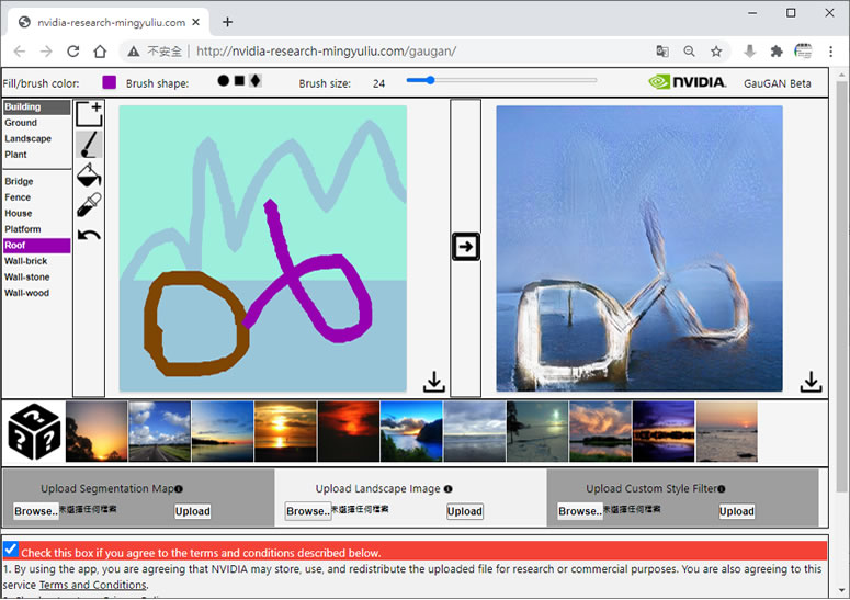 首頁線上工具影像繪圖 NVIDIA GauGAN 將塗鴉轉換為逼真圖像的免費 Web 應用 想像過自己隨手塗鴉的畫作,也能轉換成一幅逼真的圖像作品嗎?如果你覺得不可能,現在就可以透過 Nvidia GauGAN 這個免費網站來實現,該網站是 NVIDIA 公司專門用來研究人工智慧所建立的平台,使用者可以透過網站內建的像是建築物、地面、風景和植物等各種元素的畫筆工具隨意塗鴉,再將其交由伺服器對塗鴉內容進行深度學習運算後,進而產生成新的內容並轉換為逼真的圖片。 🔔 不錯過任何精彩! 立即訂閱我們的 LINE 官方帳號 每次發佈新文章時,您將會第一時間收到本站文章連結通知,輕鬆掌握最新資訊! 使用 LINE 追蹤文章更新 §相關文章,還可以參閱:跟著做就會!教你用 ChatGPT 製作具職業形象的漫畫風頭像Put!所見即所得的 AI 提示詞圖庫:讓你看著範例圖,複製就能做出同級作品Google 親自示範:Nano Banana AI 圖像編輯工具的 13 個熱門玩法照片角度不滿意?AI 幫你調整!3D Camera Control 讓舊照片任意變換視角Meta AI 免費帳戶也能用 Midjourney!無限生成 AI 圖片,台灣可用 如何使用 NVIDIA GauGAN 網站將塗鴉轉換成逼真圖片? 1.使用瀏覽器進入 NVIDIA GauGAN 網站,使用前需先勾選同意下圖紅色提醒處的使用條款。 2.在 Fill/brush color 右側處,可選擇筆刷的形狀及大小,在其下方處,可選要刷出的類型,有 Building、Ground、Landscape 及 Plant 主要類型,每個主要類型下均有細項可供挑選,挑選好之後,便可以隨意塗鴉在塗鴉欄內。 3.完成塗鴉就可以點擊向右箭頭的圖示按鈕來見證奇蹟。 4.使用者可以點擊下方的圖片來充當篩選器,也可以點擊 Upload Custom Style Filter 來上傳自己的圖片。 5.點擊塗鴉欄及生成圖片欄的右下向下箭頭圖示按鈕即可下載 PNG 圖檔。 NVIDIA GauGAN網站網址:http://nvidia-research-mingyuliu.com/gaugan/