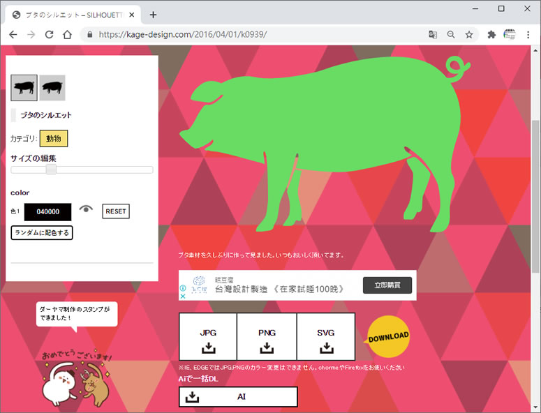 首頁免費素材圖像圖示 SILHOUETTE DESIGN 免費提供人類、動物、植物...各類輪廓剪影圖示的 PNG、JPG、SVG 與 AI 圖檔格式下載且可商用 意思的表達除了可以透過文字亦可以透過圖示來傳遞,因此,像是聊天軟體、文宣品或是場所指示處處都可見圖示的身影,SILHOUETTE DESIGN 這個網站提供動物、人類、魚類、植物、昆蟲、交通工具、節日、地圖、醫療、時尚、樂器、神祇、風景、各類製品、食物、推薦及其它不分類的剪影圖示,每個圖示均可自訂顏色、大小,並提供 PNG、JPG、SVG 與 AI 的圖檔格式下載,該網站所提供的圖示,個人與商用皆可且無須額外著名出處。 🔔 不錯過任何精彩! 立即訂閱我們的 LINE 官方帳號 每次發佈新文章時,您將會第一時間收到本站文章連結通知,輕鬆掌握最新資訊! 使用 LINE 追蹤文章更新 §相關文章,還可以參閱:精心打造的等距美學:Isocons 免費圖示資源庫,CC BY 4.0 授權Map-It:日本地圖素材的免費寶庫,從全國到市町村一網打盡PICaboo! 日系可愛免費向量圖素材庫:設計師必收的創作寶庫GAHAG:日本免費圖庫新選擇,結合アハ體驗互動遊戲的創意素材平台illust STAMPO:日式風格的免費插圖素材網站 如何取得 SILHOUETTE DESIGN 網站內的圖示? 1.使用瀏覽器進入 SILHOUETTE DESIGN 網站,可看見其分類與最近新進的輪廓剪影圖式。 2.點擊圖示後,便會進入圖示編輯與下載頁面,用戶可自訂圖示顏色與尺寸大小,並選擇圖檔格式來下載。 3.以下圖示為 SVG 圖檔格式。 SILHOUETTE DESIGN網站網址:https://kage-design.com/