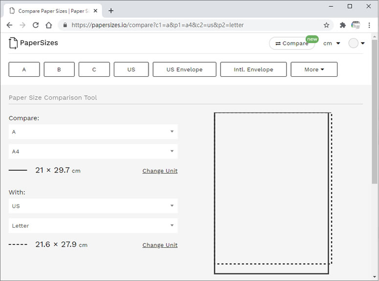 首頁線上工具生產力工具 Paper Sizes 國際紙張尺寸規格線上查詢 我們經常使用的紙張如 A4、B4 與 Letter 其長、寬尺寸各是多少?尤其是 A4 與 Letter 兩種 Size 常會被搞錯,因此購買紙張時,必須了解紙張尺寸大小,避免買錯,Paper Sizes 這個網站提供 A、B、C、US、US Envelope、Intl. Envelope .. 等各系列的紙張尺寸規格,以 A 系列來說,算是國際通用的規格,B 系列則是提供 A 系列沒有的尺寸,而這兩類的尺寸被區分 0 ~ 13 等級,基本劃分的方法就是 0 的一半就是 1,1 的一半就是 2以此定義 A0、A1、A3....,另外該網站還提供紙張的大小比較圖,使用者只需選擇兩種要比較的紙張,便可以以圖示的方法,顯示兩種紙張的差別,例如 A4 與 Letter。 🔔 不錯過任何精彩! 立即訂閱我們的 LINE 官方帳號 每次發佈新文章時,您將會第一時間收到本站文章連結通知,輕鬆掌握最新資訊! 使用 LINE 追蹤文章更新 §相關文章,還可以參閱:OpenAI 在 ChatGPT 中測試廣告|哪些帳戶受影響、廣告運作原則一次看在蝦皮當賣家,商品如何定價?手續費、免運、稅金怎麼算?蝦皮手續費計算機幫你全搞定!Google AI Plus 降到 260 元對決 ChatGPT Go!誰的功能更值得訂閱?ChatGPT Go 月付 290 元值得嗎?免費版、Plus 完整比較用 AI 做出的電影,YouTube 就看得到!一起來欣賞這部贏得百萬美元的突尼西亞短片《Lily》 如何使用 Paper Sizes ? 1.使用瀏覽器進入 Paper Sizes 網站,便可見 A系列各等級紙張尺寸列表,預設使用 mm 單位。 2.將網頁往下拉動,便可見該系列的由來及其各等級在該系列各佔尺寸比例。 3.網頁的右上方,可切換顯示單位。 4.按[ Compare ]可自選兩種紙張等級來比較。 Paper Sizes網站網址:https://papersizes.io/