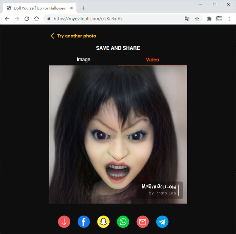 首頁線上工具影像繪圖 Doll Yourself Up For Halloween 萬聖節「鬼娃恰吉」頭像產生器 萬聖節的代表物有傑克南瓜燈、鬼魂、太妃蘋果糖及不給糖就搗蛋的活動,各有各的關聯性,至於「鬼娃恰吉」純粹是剛好沾上鬼這個字,加上萬聖節大家都會裝扮自己,「鬼娃恰吉」就成了大家模仿的對象,至於如何讓自己不化妝也能有個「鬼娃恰吉」的妝容呢?來試試 Doll Yourself Up For Halloween 這個免費的「鬼娃恰吉」頭像產生器吧,其操作過程相當簡單,上傳自己的圖片就能產生,值得稱讚的是,該網站還能以上傳圖片做出整個變鬼臉的過程,最後還能做出個露出牙齒耍狠的表情,完成的鬼娃頭像可以下載保存,也可以透過 Facebook、Snapchat、WhatsApp、eMail 或是 Telegram 分享出去。 🔔 不錯過任何精彩! 立即訂閱我們的 LINE 官方帳號 每次發佈新文章時,您將會第一時間收到本站文章連結通知,輕鬆掌握最新資訊! 使用 LINE 追蹤文章更新 §相關文章,還可以參閱:跟著做就會!教你用 ChatGPT 製作具職業形象的漫畫風頭像Put!所見即所得的 AI 提示詞圖庫:讓你看著範例圖,複製就能做出同級作品Google 親自示範:Nano Banana AI 圖像編輯工具的 13 個熱門玩法照片角度不滿意?AI 幫你調整!3D Camera Control 讓舊照片任意變換視角Meta AI 免費帳戶也能用 Midjourney!無限生成 AI 圖片,台灣可用 如何使用 Doll Yourself Up For Halloween 做出「鬼娃恰吉」的頭像? 1.使用瀏覽器進入 Doll Yourself Up For Halloween 網站,點擊[ UPLOAD PHOTO ]來上傳照片。 2.處理過程會自動識別臉孔。 3.完成處理後會產生靜態的相片與動態的變臉影片,使用者可透過圖片下的按鈕來下載或分享。 Doll Yourself Up For Halloween網站網址:https://myevildoll.com/