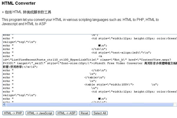 首頁線上工具開發工具 jb51.net 線上轉換網頁語言,可將 HTML 轉 PHP、HTML 轉 JavaScript 及 HTML 轉 ASP 製作網頁時,開發環境不盡相同,對於不同的環境需要不同的語言,如果要重寫,那就...,jb51.net 網站免費提供可將 HTML 轉 PHP、HTML 轉 JavaScript 及 HTML 轉 ASP 等的服務,使用方式很簡單,只要將 HTML 碼,貼到該轉換框內,依據需求選擇不同的轉換即可。 🔔 不錯過任何精彩! 立即訂閱我們的 LINE 官方帳號 每次發佈新文章時,您將會第一時間收到本站文章連結通知,輕鬆掌握最新資訊! 使用 LINE 追蹤文章更新 §相關文章,還可以參閱:網站效能健檢免費工具!PageTest 多裝置模擬效能分析及由 AI 提出改進建議Regex-Vis 圖解正則表達式的線上工具,可編寫還可驗證Sitemap Generator:線上快速產生符合 SEO 標準的網站地圖,無網址數量限制適用各類型網站網站隱私權政策產生器 Privacy Policy Generator:輸入網站名稱和網址即可輕鬆生成專屬條款Frame0:輕鬆繪製應用程式流程圖、UML 和介面雛形的免費工具,適用於 macOS 與 Windows 如何使用 HTML Converter ? 1.進入網站後,將要轉換的HTML程式碼複製後貼到轉換框內。 2.依據需求點擊[HTML -> PHP]、[HTML -> JavaScript]、[HTML -> ASP],此例為HTML -> PHP。 jb51.net網站網址:http://www.jb51.net/tools/htmlto.htm
