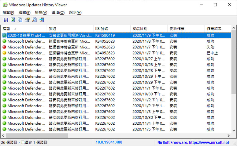 首頁電腦軟體系統應用 WinUpdatesView 檢視 Windows 作業系統更新的歷史紀錄 Windows 作業系統針對功能、漏洞、安全性或是效能的更新從來都沒停過,至於什麼時間更新,很多人是收到 Windows Update 的服務通知後就會跟著更新,時間久了,只要不出問題,大概也不會理會更新過什麼項目,但對於需要回溯,例如某個應用程式因更新後造成功能異常或不能執行時,就有必要了解 Windows 的更新歷史,WinUpdatesView 是個可以列出 Windows 作業系統更新歷史紀錄的免費且免安裝工具,對於每個 Windows 更新歷史記錄,會清楚列出標題,描述,安裝日期,操作性質(安裝、卸載、未啟動、進行中),操作結果(成功,成功出錯,失敗,中止),類別...等,讓使用者在回溯的過程中可以更加清楚的判斷。 🔔 不錯過任何精彩! 立即訂閱我們的 LINE 官方帳號 每次發佈新文章時,您將會第一時間收到本站文章連結通知,輕鬆掌握最新資訊! 使用 LINE 追蹤文章更新 §相關文章,還可以參閱:CatLock:可鎖定鍵盤的 Windows 應用程式,防止寵物意外觸碰Zen Ad blocker 瀏覽器與應用程式均適用的廣告攔截器,免費且開放原始碼TimVer 一站式顯示 Windows 版本及電腦硬體相關訊息的工具「微軟電腦管家」內含開機啟動項目管理、儲存空間最佳化等免費工具 全方位提升電腦效能Windows Startup Timer 測量 Windows 從開機到完全啟動所需時間 如何使用 WinUpdatesView 檢視 Windows 作業系統的更新紀錄? 1.解壓縮所下載的檔案,執行「WinUpdatesView.exe」便可開啟,如果需要中文化,須將語言包解壓縮後放置相同資料夾內後再執行。 2.開啟後,會直接列出所有的更新歷史紀錄,可點擊每個欄位的名稱進行排序。 3.滑鼠雙擊每個項目,可開啟詳細資料。 4.如果需要微軟的官方說明,可以點擊[ 檔案 ] > [ 在網頁瀏覽器中打開資訊 / 支援 URL ]來取得。 WinUpdatesView版本:1.16語言:中、英文性質:免費適用:Windows官方網站:https://www.nirsoft.net/utils/windows_updates_history_viewer.html