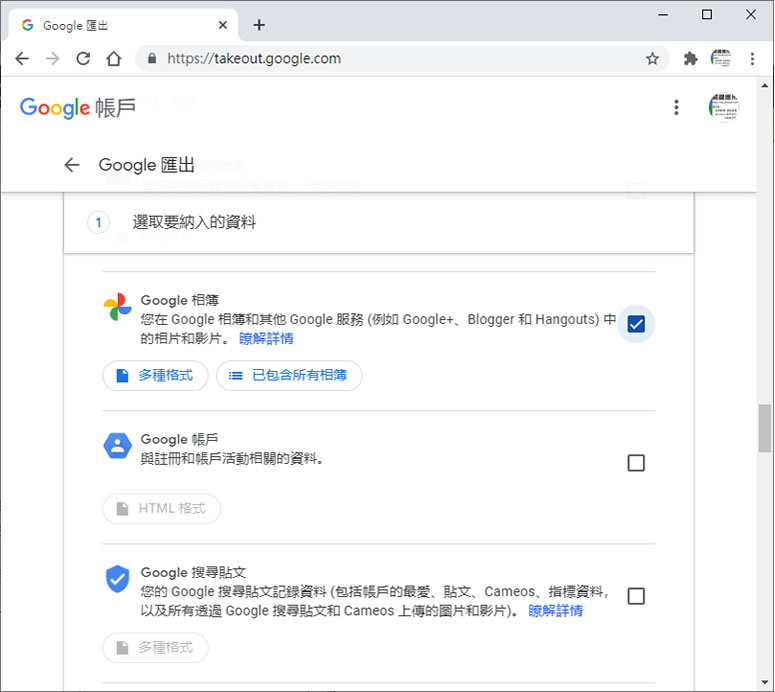 1.使用瀏覽器進入 「Google 匯出」 功能,可以看到在這裡可匯出的 Google 服務相當完整,而第一步就是要先選擇要匯出那些資料。
