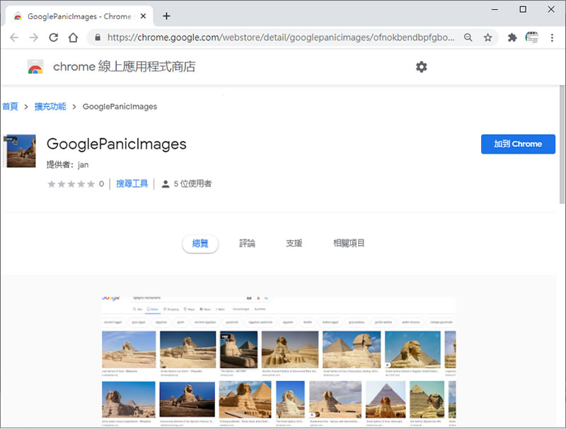 首頁瀏覽器擴充功能網頁瀏覽 GooglePanicImages 在 Google 圖片搜索上為圖片添加直達原始圖片網址的「View」按鈕 - 瀏覽器擴充功能 使用 Google 圖片搜索功能所出現的圖片,使用者點擊後,會在其右側出現該圖片的預覽及其相關資訊,再度點擊該預覽圖片後,才會進入圖片的原始網址,而該原始網址,可能是篇文章,使用者還是需要捲動瀏覽器才能找到該圖片,這樣來說,對想要直接看圖片的用戶來說,就顯得步驟繁多,GooglePanicImages 這個瀏覽器擴充功能可以來解決這個問題,安裝後,當滑鼠移置前 100張圖片的任何一張圖片時,都會出現 View 的浮動按鈕,點擊該按鈕,便可直接開啟該圖片的原始連結直接觀看。 🔔 不錯過任何精彩! 立即訂閱我們的 LINE 官方帳號 每次發佈新文章時,您將會第一時間收到本站文章連結通知,輕鬆掌握最新資訊! 使用 LINE 追蹤文章更新 §相關文章,還可以參閱:Font Finder & Style Detector 網頁字型搜尋與樣式偵測器,免費瀏覽器擴充功能MarkX 將網頁所選文字內容儲存成書籤,提供關鍵字搜尋功能U-Eyes 移動設備瀏覽網站模擬器,可擷取網頁成圖片與錄製螢幕Live CSS Tester 在任何網頁注入 CSS 進行即時測試Quick History 以網站角度快速檢視該網站的瀏覽紀錄(瀏覽器擴充功能) 如何使用 GooglePanicImages? 1.未使用 GooglePanicImages 瀏覽器擴充功能前,當按下圖片後,右側就會出現該圖的預覽圖及其相關資訊。 2.使用 Chrome 瀏覽器到達 GooglePanicImages 安裝網址後,按[ 加到 CHROME ]便會開始引導使用者進行下載與安裝。 3.完成安裝後,便會出現 GooglePanicImages 提示。 4.當重新進入 Google 圖片搜索結果集時,當滑鼠移至圖片上方,便會出現浮動的 View 按鈕,點擊後,便會開啟圖片原始連結。 GooglePanicImages性質:免費官方網站:https://chrome.google.com/webstore/detail/googlepanicimages/ofnokbendbpfgbomaepcomeciblhphip