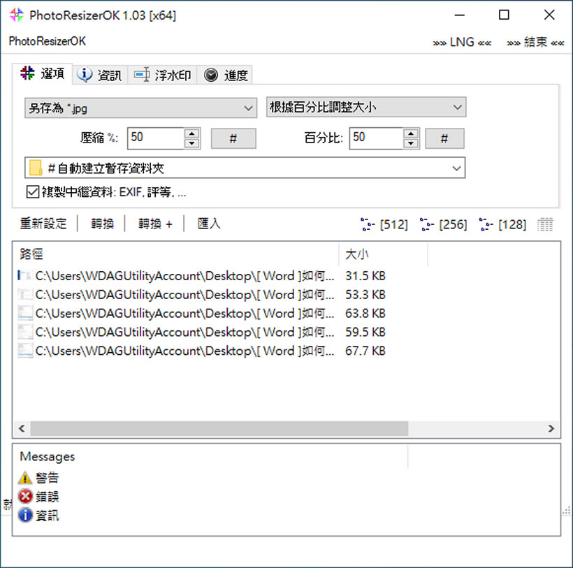 首頁電腦軟體影像繪圖 PhotoResizerOK 可快速調整圖片尺寸的免費軟體 當有大量的圖片要調整尺寸或是加入浮水印時,如果使用一般圖片編輯軟體一張張的來調整或是選擇線上工具,先上傳在下載,那就是事倍功半,吃力又不討好了,所以選對圖片調整工具很重要,softwareok 所推出的 PhotoResizerOK 這套免費又免安裝的軟體,可以快速的協助我們做圖片批次尺寸調整及加入浮水印的工作,調整尺寸時,可以選擇調整的依據,可以僅執行壓縮,也可以按百分比或是依據圖片的高、寬來調整,而加入浮水印時,可以自行設計文字樣式、顏色及浮水印的大小。 🔔 不錯過任何精彩! 立即訂閱我們的 LINE 官方帳號 每次發佈新文章時,您將會第一時間收到本站文章連結通知,輕鬆掌握最新資訊! 使用 LINE 追蹤文章更新 §相關文章,還可以參閱:告別訂閱制!Canva 旗下 Affinity 永久免費,向量設計、影像處理、排版工具全面開放Pineapple Pictures 載入速度超快的相片檢視器(免安裝)ShortDoorNote 將輸入的文字快速轉成圖片Bzzt! Image Editor 圖片批次壓縮、轉檔及尺寸調整的免費工具ImageGlass 可幻燈片自動播放的免費看圖片軟體 如何使用 PhotoResizerOK? 1.解壓縮所下載的檔案,執行「PhotoResizerOK_x64.exe」便可開啟,開啟後,可先調整應用程式的介面語言。 2.接下來按[ 匯入 ]或是將圖片使用滑鼠選取後,拖拉到加入到要調整尺寸的列表中。 3.在[ 選項 ]頁籤中,可以選擇調整依據、調整後要存放的路徑及壓縮比。 4.在[ z浮水印 ]頁籤中,可以選擇是否替圖片加入浮水印及浮水印的樣式。 5.接下來按[ 轉換 ]便可完成圖片尺寸批次調整的工作。 PhotoResizerOK版本:2.77語言:中、英文性質:免費適用:Windows官方網站:https://www.softwareok.com/?seite=Freeware/PhotoResizerOK/History下載: Windows 32bit 按我下載 Windows 64bit 按我下載