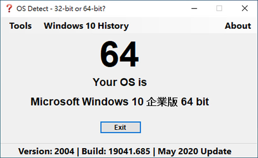 首頁電腦軟體系統應用 OS Detect 檢查 Windows 作業系統是 64位元還是 32位元 購買或使用免費的 Windows 應用程式時,有些會區分成 32bit 或 64bit,這是只要執行的 Windows 作業系統位元數,通常 32bit 的應用程式在 64bit 的作業系統內都可以執行,要知道自己電腦的 Windows 作業系統位元數,可以透過內建的控制台來查詢得知,也可以透過 命令提示字元下指令 來取得,當然,最簡單的方法就是執行 OS Detect 這個免安裝的應用程式,一舉幫你查出作業系統的位元數及版本,如此一來,選對可以在作業系統執行的應用程式,執行效能也能有改善。 🔔 不錯過任何精彩! 立即訂閱我們的 LINE 官方帳號 每次發佈新文章時,您將會第一時間收到本站文章連結通知,輕鬆掌握最新資訊! 使用 LINE 追蹤文章更新 §相關文章,還可以參閱:CatLock:可鎖定鍵盤的 Windows 應用程式,防止寵物意外觸碰Zen Ad blocker 瀏覽器與應用程式均適用的廣告攔截器,免費且開放原始碼TimVer 一站式顯示 Windows 版本及電腦硬體相關訊息的工具「微軟電腦管家」內含開機啟動項目管理、儲存空間最佳化等免費工具 全方位提升電腦效能Windows Startup Timer 測量 Windows 從開機到完全啟動所需時間 如何使用 OS Detect? 1.執行 OS Detect 後,所出現的視窗就會將作業系統位元數、版本等相關資訊列出。 2.想要知道 Windows 10的版本歷史,可以按上方功能表的[ Windows 10 History ]。 OS Detect版本:1.3.2.9語言:英文性質:免費適用:Windows官方網站:https://www.wintools.info/index.php/os-detect-32-bit-or-64-bit下載:按我下載