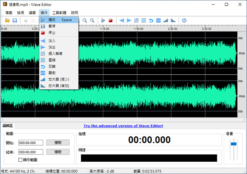 首頁電腦軟體影音視聽 Wave Editor 聲音檔案免費編輯軟體 播放音樂時覺得與其它聲音檔都來的大或小聲或是想要自製有淡出淡入效果的手機鈴聲,可以來使用 Wave Editor 這套免費的 Windows 應用程式,其支援 MP3、WMA 及 WAV 的聲音檔案類型,具有可對聲音檔案進行剪輯、放大或減少音量、做出淡入或淡出的聲音效果、插入靜音、壓縮、反轉及顛倒等功能,繁體中文介面,操作直覺不複雜。 🔔 不錯過任何精彩! 立即訂閱我們的 LINE 官方帳號 每次發佈新文章時,您將會第一時間收到本站文章連結通知,輕鬆掌握最新資訊! 使用 LINE 追蹤文章更新 §相關文章,還可以參閱:超實用免費軟體!DCP-o-matic 讓你的影片變成電影院 DCP 播放格式語音轉文字免費工具 AsrTools 輕鬆搞定字幕、筆記或歌詞整理免費的 PotPlayer 開始搭載 Whisper AI,讓你即時生成字幕與翻譯,外語影片輕鬆看SpleeterGUI:簡單易用的 AI 音軌分離免費開源工具如何使用 Microsoft Clipchamp 自動產生影片字幕? 如何使用Wave Editor? 1.完成安裝,開啟 Wave Editor 後,可以透過介面上方功能表 File > seeting 來設定介面語言。 2.載入聲音檔案後,會顯示該檔案的聲音波型,而其可操作的的部分,全部可在[ 操作 ]功能表內取得。 3.在編輯區的範圍處設定要編輯的範圍,可勾選[ 顯示範圍 ],顯示目前要操作的區域。 在編輯區上岸滑鼠右鍵叫出功能表: 刪除:刪除該選取區 另存選取範圍:是將選取範圍存成另一個新的聲音檔案 4.淡入及淡出的操作同樣是在選取範圍內,按淡入或淡出的圖示按鈕即可完成。 5.調整音量是用百分比。 ※完成調整後,可按[ 檔案 ] > [ 另存為 ]將編輯好的聲音檔案,儲存成新的 MP3檔 Wave Editor版本:4.1.0.0語言:中、英文性質:免費適用:Windows官方網站:https://www.wave-editor.com/下載:按我下載