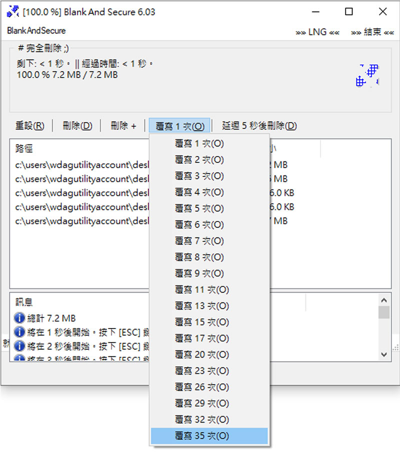 首頁電腦軟體資訊安全 BlankAndSecure 讓刪除的檔案無法被還原 電腦內被刪除的檔案,如果未被覆寫過是有很大的機率被還原的,且當初 Windows 若設有「還原點」或是「檔案歷程記錄」只要未過時間點,基本上都可以被找回來,更何況還有專業的檔案救援軟體或公司來協助,所以檔案遭外流,也有可能來自你確認已刪除該檔案內的電腦,那麼,該如何才能徹底刪除檔案使知無法復原呢?要報廢的電腦,該硬碟就不用客氣了,如果要移交那除了要注意還原點的時間,其他已刪除的檔案,可以交給 BlankAndSecure 這類的軟體,該類軟體可以協助用戶刪除檔案,並在檔案刪除後進行該磁區的覆寫,使之無法還原。 🔔 不錯過任何精彩! 立即訂閱我們的 LINE 官方帳號 每次發佈新文章時,您將會第一時間收到本站文章連結通知,輕鬆掌握最新資訊! 使用 LINE 追蹤文章更新 §相關文章,還可以參閱:PDFEncrypt 替 PDF 檔案加入禁止列印、注釋、複製、修改及開啟密碼等保全限制WHDownloader 微軟 Office及 Windows 更新檔下載器Free Virtual Keyboard 虛擬鍵盤免費軟體 (螢幕小鍵盤)[ Windows Server ]如何使用 win-acme 申請 Let's Encrypt SSL 並安裝到 IIS?微軟 Windows File Recovery 檔案救援免費工具 如何使用 BlankAndSecure? 1.開啟 BlankAndSecure,可以先設定介面所要使用的語言。 2.按照介面上的操作說明,將檔案使用滑鼠拖拉進視窗中。 3.路徑處便會顯示每個檔案的路徑,按[ 重設 ]可重來; 按[ 刪除 ]就開始刪除動作,而刪除是有些選項可選的.[ 刪除 + ] 可設定檔案刪除完後電腦要執行的動作。。 4.[ 覆寫 1 次 ] 可設定檔案刪除後該磁區要覆寫的次數;延遲秒數,可設定延遲幾秒後刪除。 5.設定好之後,在按[ 刪除 ]標籤按鈕,便會開始刪除檔案的動作。 BlankAndSecure版本:7.55語言:中、英文性質:免費適用:Windows官方網站:https://www.softwareok.com/?seite=Microsoft/BlankAndSecure/History下載: 32-bit 按我下載 64-Bit (x64) Windows 按我下載