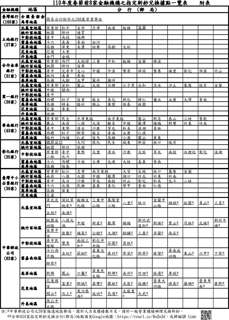 首頁線上工具生活資訊 中央銀行 110年農曆春節前兌換新鈔各銀行與郵局一覽表 農曆春節快到了,除了要大掃除外,包紅包的新鈔票也得準備,不論是給長輩、小孩,在傳統的除舊佈新的觀念下,鈔票更是要拿舊換新,尤其是紅色的 100元有誠意又討喜,中央銀行已選定臺灣銀行、臺灣土地銀行、合作金庫商業銀行、第一商業銀行、華南商業銀行、彰化商業銀行、臺灣中小企業銀行及中華郵政公司等 8家金融機構,選定 454家分行(郵局)為本(110)年指定兌鈔據點,新鈔兌換日程訂於本年 2月 3日(週三)至 2月 9日(週二),計連續5個營業日,上述期間,7家銀行之 371家指定兌鈔分行,以及中華郵政公司位於都會區之24家指定兌鈔郵局,均將開設「新鈔兌換專櫃」,以加強服務民眾,另 59家偏遠地區郵局,則於一般營業櫃檯辦理兌換新鈔,且為加強服務民眾,中央銀行特於「新鈔兌換地點一覽表」中建立地圖連結,民眾於可於中央銀行官網、臉書及行動 APP上可輕鬆查詢到指定兌鈔地點位置,另也結合Google地圖 ( https://reurl.cc/8nZn3d )及 QR Code,方便民眾使用手機查找,要兌換新鈔,趕快來看看住家附近有沒有換新鈔的銀行或郵局地點吧。 🔔 不錯過任何精彩! 立即訂閱我們的 LINE 官方帳號 每次發佈新文章時,您將會第一時間收到本站文章連結通知,輕鬆掌握最新資訊! 使用 LINE 追蹤文章更新 §相關文章,還可以參閱:超商取貨不再被看光個資!一篇搞懂數位憑證皮夾怎麼用節電獎勵改了!2026 起不再「省1度領84元」,新舊制差異懶人包YouTube Recap 首次登場!從頻道排行到性格分析,一次看懂你的 2025 觀看全記錄2026年教召開放查詢!115年14天教召新制查詢步驟、薪水、免召申請、除役年齡一次看LINE Pay Money 開通四重禮!3年免手續費+30元儲值金,12/31前限定 110年度春節前 8家金融機構及 454家分行(郵局)之指定新鈔兌換分行一覽表 1.按我下載 110年度春節前8家金融機構之指定新鈔兌換據點一覽表 2.需要銀行或郵局詳細位置圖,可以點擊一覽表內的地名或點擊 https://reurl.cc/8nZn3d來開啟 Google 地圖。 中央銀行「農曆春節前新鈔兌換事宜」新聞稿網站網址:https://www.cbc.gov.tw/tw/cp-302-128165-39934-1.html