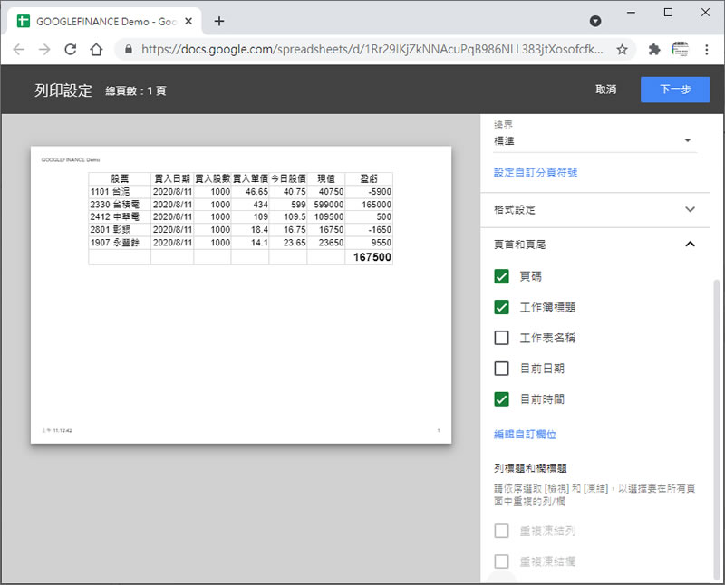 首頁操作技巧Google 試算表 如何在「Google 試算表」中加入頁首或頁尾? 完成編輯後的「Google 試算表」,如果需要在頁首或頁尾加入頁碼、日期、時間、工作簿標題或是工作表名稱等資訊並指定其顯示位置,該如何做呢?這時候,我們可以透過「列印」功能來將以上的資訊加入,並透過編輯自訂欄位來指定顯示格式及其顯示位置。 🔔 不錯過任何精彩! 立即訂閱我們的 LINE 官方帳號 每次發佈新文章時,您將會第一時間收到本站文章連結通知,輕鬆掌握最新資訊! 使用 LINE 追蹤文章更新 §相關文章,還可以參閱:「Google 試算表」如何讓儲存格的寬度、高度大小都相同?「Google 試算表」如何使用 SEQUENCE 函數傳回有序數字陣列?「Google 試算表」如何計算兩個數字之間的差異百分比?「Google 試算表」如何計算儲存格中不重複值個數?「Google 試算表」如何免計算就可得知所圈選儲存格內的加總、平均值、最大及最小值? 如何在「Google 試算表」中加入頁首或頁尾? 1針對要加入頁首或頁尾的試算表,可以按[ 檔案 ] > [ 列印 ]。 2.點擊[ 頁首和頁尾 ]來展開內容,勾選所要選項,便會逐一顯示在列印內容內。 3.如果對位置或格式位置有自訂的需求,也可以點擊[ 編輯自訂欄位 ],編輯完後,記得要按右上角的[ 確認 ]按鈕,才能反映到列印頁面。