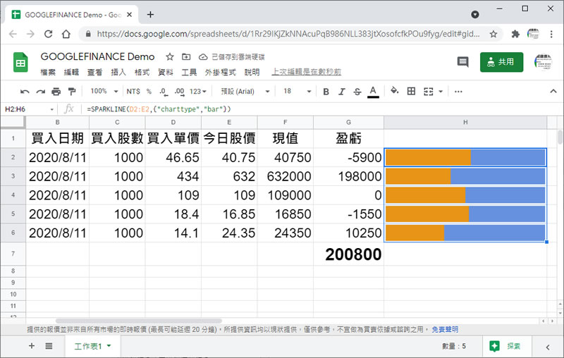 4.圖表類型有 line、bar、column 及 winloss 可供選擇;也可以更改長條圖的顏色 =SPARKLINE(D2:E2, {"charttype","bar"; "color1","red";"color2","green"})。