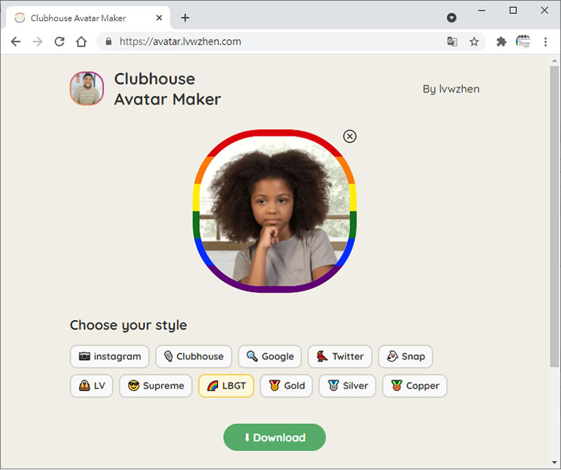 首頁線上工具影像繪圖 Clubhouse Avatar Maker 會員網站頭像產生器 現在的社交網站或是通訊軟體,甚至是 Windows 作業系統,只要是有需註冊帳號的大大小小網站、APP,大都會要求提供代表個人的頭像圖案,以玆識別,至於頭像如何產生,較知名的網站,大都有提供製作工具,當然使用者也可以自行透過其他工具來製作 Clubhouse Avatar Maker 這個網站可產生 instagram、Clubhouse、Google、Twitter、Snap、LV、Supreme、LBGT、Gold、Silver、Copper 等各種風格的頭像,使用者僅需上傳圖片,然後選擇風格,隨即就可以下載做後續的應用。 🔔 不錯過任何精彩! 立即訂閱我們的 LINE 官方帳號 每次發佈新文章時,您將會第一時間收到本站文章連結通知,輕鬆掌握最新資訊! 使用 LINE 追蹤文章更新 §相關文章,還可以參閱:Google 親自示範:Nano Banana AI 圖像編輯工具的 13 個熱門玩法照片角度不滿意?AI 幫你調整!3D Camera Control 讓舊照片任意變換視角Meta AI 免費帳戶也能用 Midjourney!無限生成 AI 圖片,台灣可用Nano Banana Pro 幫你放煙火,地點、形狀由你指定Mock.Club:免費 AI Mockup 素材庫,拖曳截圖立即生成專業展示圖 如何使用「Clubhouse Avatar Maker」產生不同風格的頭像? 1.使用瀏覽器進入 Clubhouse Avatar Maker 網站,然後點擊[]來選擇圖片。 2.在圖片的下方,可選擇所要的樣式。 3.完成後,點擊[ Download ]就可以下載。 Clubhouse Avatar Maker網站網址:https://avatar.lvwzhen.com/