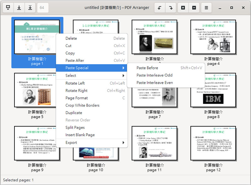 PDF 檔案流通率廣,因此相關的應用工具也相當多,如果是屬 Web 服務,總免不了要上傳網站進行處理,這就有了資訊安全的風險,PDF Arranger 是一套免費的 PDF 檔案 Windows 應用程式,其操作相當直覺,開啟檔案後,便會將所有頁面採預覽方式列出,使用者可以對頁面進行刪除、複製、貼上、旋轉、切割、調整大小、插入空白頁面、裁剪頁面白邊、順序調整及對頁面匯出成新的 PDF 檔案等諸多功能。