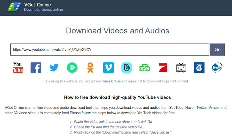 首頁線上工具上傳下載 VGet 輸入影片網址,就可線上下載,支援 YouTube、Naver、Twitter、Vimeo... 要下載 YouTube 影片,最簡便的方式就是使用線上輸入影片網址就可以下載的網路服務,不過,有用過的使用者應該都知道,此類的服務通常在下載的時候有很多誘導式的跳轉廣告出現,讓人心生反感,而 VGet 這個網站,同樣屬於前述的操作方式,但特別的是其下載很乾脆,部會拖泥帶水的跳來跳去,且該服務支援 YouTube、Naver TV、Twitter、Vimeo、Facebook、OK.RU、V LIVE...等網站,有需要的用戶,可以多加利用。 🔔 不錯過任何精彩! 立即訂閱我們的 LINE 官方帳號 每次發佈新文章時,您將會第一時間收到本站文章連結通知,輕鬆掌握最新資訊! 使用 LINE 追蹤文章更新 §相關文章,還可以參閱:P2PFileShare 線上 P2P 傳檔免費工具,免安裝無檔案大小限制直接瀏覽器傳輸KuaishouVideoDownload:快手影片下載免費工具,無浮水印快速儲存一站搞定影片下載與轉檔!OFA Downloader 支援 YouTube、IG、TikTok 等數百站TwSaver 免費下載 X 影片工具,支援高畫質、免安裝,無限制使用次數熱門影片平台一鍵抓!Best Video Downloader 支援 YouTube、抖音、B站影片下載超簡單 如何使用 VGet 下載 YouTube 影片? 1.使用瀏覽器進入 VGet 網站後,便可看到其支援的影音平台,以下以 YouTube 為例說明,輸入影片網址後,按[ Go ]。 2.稍後,便會列出可以下載的影音格式,包含影片及聲音檔案。 3.點擊所要檔案格式後方的[ Download ]便可以轉到播放頁面,利用播放器的下載功能來下載。 VGet網站網址:https://www.vget.online/