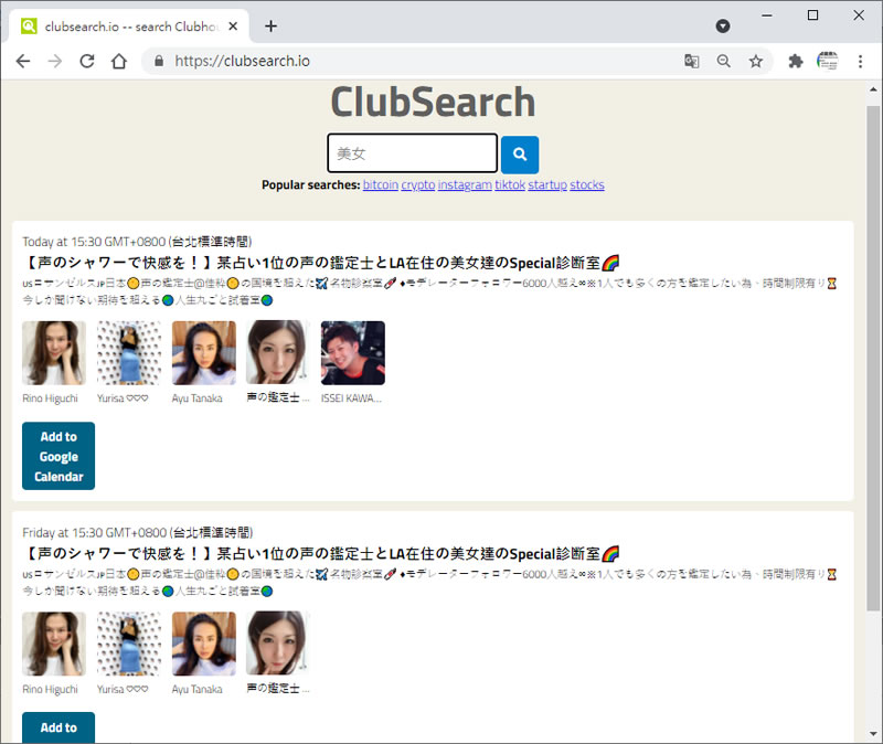 首頁線上工具社群與通訊 ClubSearch 可利用關鍵字搜尋 ClubHouse 的用戶或「房間」名稱 如果世上只有自己有電話,估計沒甚麼用處,當電話用戶越來越多時,就能顯現出電話的價值,同理,如果已有 ClubHouse 的帳號,卻不知道哪裡有有自己感興趣的房間可加入,實在也很浪費,ClubSearch 是個可以用關鍵字來搜尋「房間」或用戶名稱的搜尋引擎,可以搜尋過去及未來的活動,如果屬於未來,還可以透過期內建功能加入到「Google 日曆」,以提醒自己。 🔔 不錯過任何精彩! 立即訂閱我們的 LINE 官方帳號 每次發佈新文章時,您將會第一時間收到本站文章連結通知,輕鬆掌握最新資訊! 使用 LINE 追蹤文章更新 §相關文章,還可以參閱:馬上爆富超好用!LINE Bank × 胸毛公寓招財貼圖,農曆新年免費領取馬年行大運!精選8款新春招財LINE免費貼圖,OPEN將、罐頭豬陪你過好年「LINE 社群」也能開店!打通聊天到下單的最後一哩路存發票也能玩遊戲!LINE 發票管家改版重點一次看LINE 教你玩轉 2025聖誕節!召喚熊大特效、秒送禮物、搶免費貼圖全攻略 如何使用 ClubSearch ? 1.使用瀏覽器進入 ClubSearch 後,便可以輸入關鍵字來搜尋自己感興趣的活動或是用戶名稱。 2.以下是利用美女及直播關鍵字搜尋的結果。 3.針對即將展開的活動,可以按[ Add to Google Calendar ]先將他放到 google 日曆中,方便提醒自己。 ClubSearch網站網址:https://clubsearch.io/