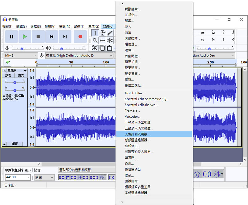 4.要去除人生最簡單的操作就是利用功能表中[ 效果 ] > [ 人聲抑制與隔離 ]。
