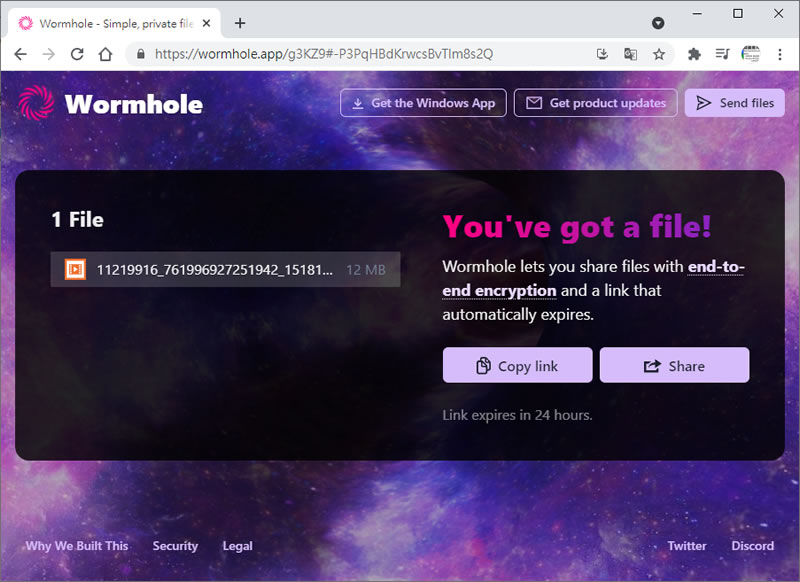 首頁線上工具上傳下載 Wormhole 利用網址來傳送檔案的免費線上服務 要傳送檔案,使用通訊軟體或是雲端硬碟,都是不錯的方法,不過通訊軟體通常都有檔案大小限制,而雲端硬碟則需要設定權限後才能取得分享的相關網址,有些麻煩。Wormhole 是個線上分享檔案的免費網站服務,檔案大小有 10G的限制,傳輸採端對端加密,相關的下載連結也只保存一天後,即會自動刪除,其操作方法相當簡單,使用者只須將檔案上傳,便能取得一個下載網址,將該網址發給需要下載的用戶,對方同樣使用瀏覽器,貼上該網址後,便可以下載,發送端無須完整上傳,接收用戶就可以邊下載,相當方便。 🔔 不錯過任何精彩! 立即訂閱我們的 LINE 官方帳號 每次發佈新文章時,您將會第一時間收到本站文章連結通知,輕鬆掌握最新資訊! 使用 LINE 追蹤文章更新 §相關文章,還可以參閱:M3U8 Player:本地瀏覽器處理,播放、下載、轉 MP4 一站免費完成getM3U8 免費線上工具:輕鬆下載 M3U8 串流影片並轉檔 MP4SnapWC 免費影片下載器:一鍵搞定 YT、IG、FB、抖音等 10,000+ 平台影片、音訊、圖片需要分享圖片連結?試試 PiXhost 免費圖床服務P2PFileShare 線上 P2P 傳檔免費工具,免安裝無檔案大小限制直接瀏覽器傳輸 如何使用 Wormhole 網站來傳送檔案? 1.使用瀏覽器進入 Wormhole 網站,可注意其使用規範。 2.將要傳送的檔案使用滑鼠拖拉放到虛線框內,便會開始上傳,按[ Copy link ]就可以取得相關網址。 3.將網址發給接收端後,接收端同樣開啟瀏覽器貼上該網址,便可以來下載。 Wormhole網站網址:https://wormhole.app/