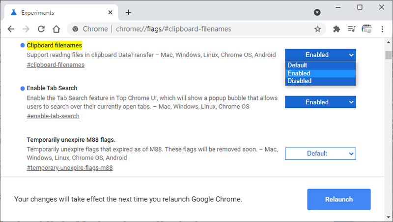 首頁操作技巧Google 如何讓 GMail 可以使用「Ctrl+C」「Ctrl+V」 來附加要傳送的檔案? 電子郵件要是有附加的檔案要傳送,就須使用插入或附加檔案的方式, 先開啟檔案選取視窗,再選取檔案來上傳,步驟有點多,而如果是使用最新版的 Google Chrome(v91)瀏覽器來開啟 GMail,我們可以開啟 clipboard-filenames 這項功能,使 GMail 可以利用 Windows 作業系統內建的「Ctrl+C」複製、「Ctrl+V」貼上,這兩個快速鍵來附加檔案,快速又方便。 🔔 不錯過任何精彩! 立即訂閱我們的 LINE 官方帳號 每次發佈新文章時,您將會第一時間收到本站文章連結通知,輕鬆掌握最新資訊! 使用 LINE 追蹤文章更新 §相關文章,還可以參閱:別再只會用兩指縮放 Google 地圖了!這些隱藏手勢讓你效率翻倍照著做就會!Google 官方釋出 NotebookLM 簡報製作的 8 種範例教學機車族專屬!Google Maps 推出 5 款超萌機車圖示 × 8 種顏色,設定步驟看這篇Google Skills:3000+ 門課程助你打造 AI 時代競爭力Google Vids 全解析:一文看懂功能、免費版限制及完整操作步驟 如何讓 GMail 可以直接使用「Ctrl+C」「Ctrl+V」 來附加要傳送的檔案? 1.開啟 Chrome 瀏覽器,在其網址列輸入 chrome://flags/#clipboard-filenames 後,按[ Enter ]鍵盤鍵,並將原 Defaule 值改成 Enabled 後,按[ Relaunch ]重啟 Chrome 瀏覽器。 2.重啟後,進入 GMail 便可以使用 「Ctrl+C」「Ctrl+V」 來附加要傳送的檔案。