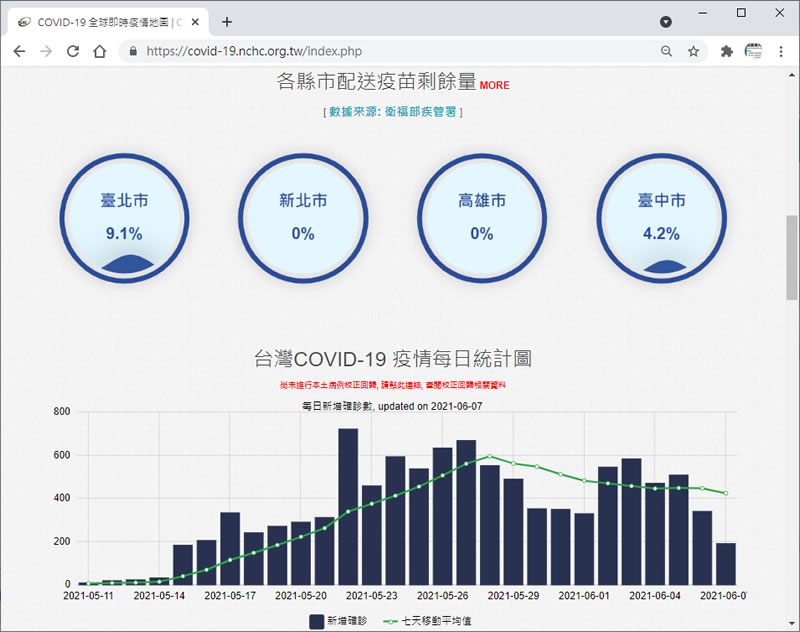 首頁線上工具生活資訊 由國研院國網中心所製作的台灣 COVID-19 疫情及疫苗視覺化統計資料 每日下午 2點鐘的 COVID-19 最新疫情記者會應該會受到很多人關注,因為這跟每個人的生活切身有關,雖說這不是可以接收疫情相關資訊來源的唯一管道,但如果之後透過媒體的來查詢就需要注意該則新聞的時間點,避免被已過時的資訊誤導,而另外一個正確的資訊來源就是透過疾病管制署的網站取得疫情的相關資料,像是確診及死亡人數、新聞稿、澄清專區、疫苗...等等的相關管制規定及統計資料,均可以在這個網站取得最正確的資訊,另外,不習慣看冷冰冰的統計數據,也可以到國研院國網中心來看較有溫度的視覺化統計資料,其資料來源同樣是疾病管制署,只不過將其統計資料採可視化的方式呈現,更讓人一目瞭然,例如,最近有關疫苗的施打順序、各縣市目前疫苗庫存量等等。 🔔 不錯過任何精彩! 立即訂閱我們的 LINE 官方帳號 每次發佈新文章時,您將會第一時間收到本站文章連結通知,輕鬆掌握最新資訊! 使用 LINE 追蹤文章更新 §相關文章,還可以參閱:2026汽車隔熱紙新制228上路!前擋70%、前側窗40%透光率規定,新舊車主必知重點Apple TV+ 2026 全年節目大公開:每週推出全新原創劇集,《泰德拉索》第四季回歸!小米米家電磨筆開賣!NT$969 入手纖細筆型設計,木雕、模型打磨一筆搞定史上最高12億!台彩春節大紅包連抽到元宵,銷售時間、玩法規則一次看2026年特色春聯索取指南:總統府、法鼓山、靈鷲山等重點發放據點整理 國研院國網中心-COVID-19 全球疫情地圖 1.使用瀏覽器進入 國研院國網中心-COVID-19 全球疫情地圖 網站,除了可以看到全球疫情的相關資訊外,而另外一個重點就是台灣疫情的相關報告。 2.透過每個標題旁的 [ more ]可展開所有的數據資料,例如 2021年本土病例分佈 3.各縣市配送疫苗剩餘量,採如下圖的方式呈現。 4.另外,疫苗接種則是大家目前相當關心的資訊。 COVID-19 全球疫情地圖網站網址:https://covid-19.nchc.org.tw/index.php