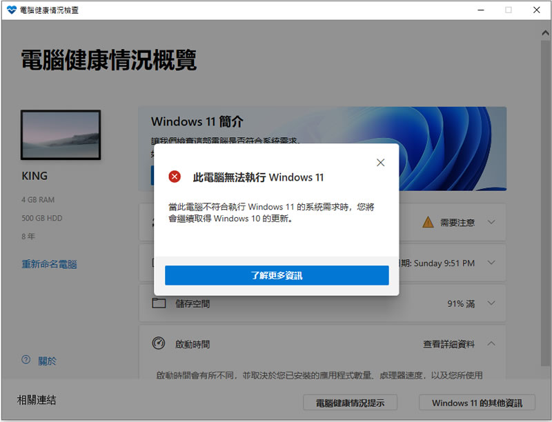首頁電腦軟體系統應用 快來檢查電腦是否符合 Windows 11 系統最低需求,為免費升級做好準備 Windows 11 作業系統即將推出,而且按微軟的說法 Windows 10 電腦可以在 Windows 11 首度發行時免費升級,這就意味著只要符合 Windows 11 系統的最低需求就可以免費取得微軟最新版本的作業系統,微軟也在其官網公布系統硬體的最低需求列表,並推出 WindowsPCHealthCheck 檢測程式,讓使用者自行檢測目前電腦是否符合升級到 Windows 11的要求,符合固然沒問題,不符合也不用擔心,因為 Windows 10 至少會維持支援到 2025 年。 🔔 不錯過任何精彩! 立即訂閱我們的 LINE 官方帳號 每次發佈新文章時,您將會第一時間收到本站文章連結通知,輕鬆掌握最新資訊! 使用 LINE 追蹤文章更新 §相關文章,還可以參閱:CatLock:可鎖定鍵盤的 Windows 應用程式,防止寵物意外觸碰Zen Ad blocker 瀏覽器與應用程式均適用的廣告攔截器,免費且開放原始碼TimVer 一站式顯示 Windows 版本及電腦硬體相關訊息的工具「微軟電腦管家」內含開機啟動項目管理、儲存空間最佳化等免費工具 全方位提升電腦效能Windows Startup Timer 測量 Windows 從開機到完全啟動所需時間 如何使用 WindowsPCHealthCheck 檢查系統是否符合升級 Windows 11的最低需求? 1.先來看看微軟在官方網站公布 Windows 11 的最低系統需求。 2.上表,對於不熟悉硬體的用戶來說等於沒說,但沒關係,我們可以下載檢查相容性的程式來檢查。 3.完成安裝,開啟「電腦健康情況檢查」應用程式就會顯示目前的系統規格,以及像是有無開啟備份與同步處理功能、記住喜好設定、最後 Windows Update 時間、儲存空間和啟動時間等幾個主要項目,點選最上方 Windows 11[ 立即檢查 ]就能知道電腦有無符合免費升級的系統需求。 4.最後就會得出答案。 WindowsPCHealthCheck語言:中文性質:免費官方網站:https://www.microsoft.com/zh-tw/windows/windows-11下載:按我下載