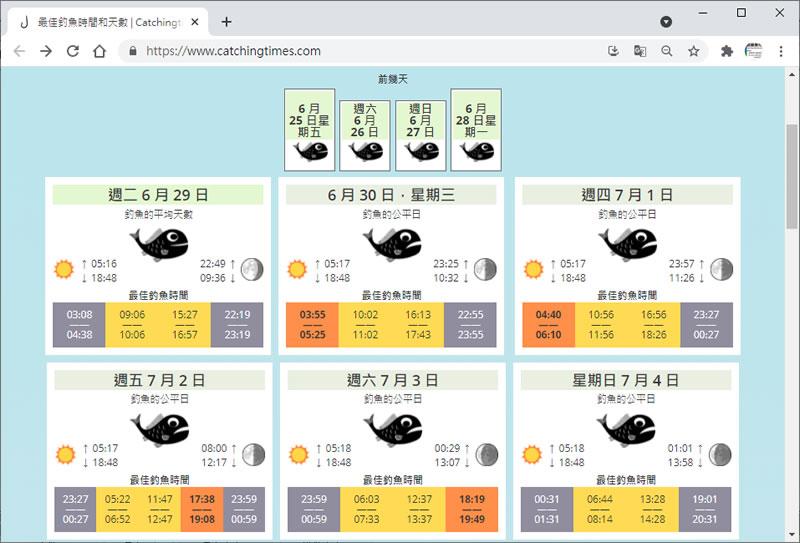 首頁線上工具生活資訊 Catchingtimes.com 幫你選出每日最佳釣魚的時間點 釣魚是很多人喜愛的休閒活動,不論是準備、等待或是搏魚的過程都是享受,如果是喜歡海釣,那麼除了安全裝備不可少之外,當然一天 24小時該何時去釣魚,才會比較有勝算呢?Catchingtimes.com 這個網站利用潮汐的變化來預測這些時間,而所謂的潮汐指的是海洋表面受到太陽和月球的萬有引力作用所引起的漲落現象,換句話說,魚類的活動會與潮汐變化息息相關,由此推斷出所在地點一天之中最適合釣魚的時間,喜歡釣魚又常常抓不準時間嗎?來試試這個網站所推薦的時間點。 🔔 不錯過任何精彩! 立即訂閱我們的 LINE 官方帳號 每次發佈新文章時,您將會第一時間收到本站文章連結通知,輕鬆掌握最新資訊! 使用 LINE 追蹤文章更新 §相關文章,還可以參閱:Apple Music 台灣新用戶優惠:6個月免費暢聽,領取方式與限制一次看!2026春節追劇清單!Netflix 2月必看攻略:燒腦推理、火爆動作片,陪你從初一爽追到開工!459 萬人搶 60 萬份!運動幣中獎號碼公布,快查你的身分證尾數都馬一起GO!LINE GO新年優惠最高拿$800優惠券,還有一個月乘車金等你抽過年搭高鐵自由座要排多久?看LINE就知道 台灣高鐵×LINE TODAY推出春節限定燈號預估服務 如何使用 Catchingtimes.com? 1.使用瀏覽器進入 PCatchingtimes.com 網站,便會偵測目前瀏覽器所在位置,從而推斷出目前位置最佳釣魚日期及時間點。 2.當然,目前所在位址,不見得是你要去釣魚的位置,我們可以透過右上角的搜尋框來搜尋。 3.顯示該地點的所挑選的日期及時間。 4.細看所提供的資訊卡,其提供每日太陽與月亮的出落時間外,還會分別會列出日出日落、白天及夜晚的各最佳釣魚時間點。 Catchingtimes.com網站網址:https://www.catchingtimes.com/