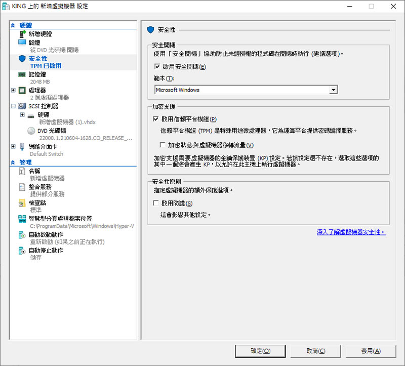 首頁操作技巧Windows 如何在 Hyper-V 中啟用 TPM 來安裝 Windows 11虛擬機器? 微軟為了讓 Windows 10 可以順利升級到 Windows 11作業系統,推出了 WindowsPCHealthCheck 檢測程式,讓使用者自行檢測目前電腦硬體是否符合升級到 Windows 11的要求,就目前不符合升級的電腦硬體來說,基本上都是卡在 TPM(Trusted Platform Module)模組,目前最新為 TPM 2.0,其可以用來處理包括加密、解密、金鑰建立,以及取得擁有權等,如果目前電腦沒有 TPM 是不是就沒辦法來安裝 Windows 11呢?其實也不然,我們可以透過 Windows 10內建的 Hyper-V 並啟用信賴平台模組就可以順利來安裝 Windows 11虛擬機器。 🔔 不錯過任何精彩! 立即訂閱我們的 LINE 官方帳號 每次發佈新文章時,您將會第一時間收到本站文章連結通知,輕鬆掌握最新資訊! 使用 LINE 追蹤文章更新 §相關文章,還可以參閱:你的 Windows 筆電是真睡還是裝睡?一個設定終結背包發熱耗電學起來!微軟親授 10 個提升 Windows PC 效能的技巧如何升級 Windows 11 25H2?最新版本功能亮點與完整更新步驟Windows 工作列時鐘顯示秒數:真的會影響電池續航力嗎?LTT Labs 完整實測解析Windows 快速取出資料夾檔案名稱清單!內建功能輕鬆搞定,不用額外軟體 取得 Windows 11: 如何下載 Windows 11 Insider Preview ISO 檔案? 如何在 Hyper-V 中啟用 TPM 以安裝 Windows 11? 1.開啟 Hyper-V 之後,按右上角[ 快速建立 ]來新建虛擬機。 2.按[ 本機來源安裝 ]並將 ISO 檔來源指向由 如何下載 Windows 11 Insider Preview ISO 檔案? 所下載的 ISO 檔案,然後按[ 建立虛擬機器 ]。 3.稍後,便可以看到建立成功的視窗,接下來,按[ 編輯設定 ]。 4.在安全性的選項中,勾選[ 啟用信賴平台模組 ],再按[ 確定 ]。 5.回到 Hyper-V 管理介面,選擇剛剛建立的新增虛擬機器,再按右下角的[ 連線 ]。 6.按[ 啟動 ]開始安裝 Windows 11。