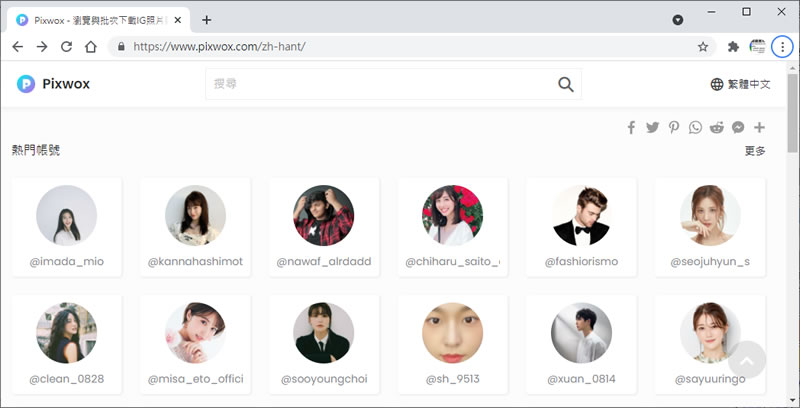 首頁線上工具上傳下載 Pixwox 免帳號登入就可以瀏覽與下載 Instagram 內的圖片與影片 Instagram 社交平台以圖片及影片為主,一般要瀏覽就必須註冊其帳號,而即便是有了帳號後,想要下載其內的圖片或影片也還需要透過工具才有辦法下載。Pixwox 這個網站將前述動作完全免除,只要進入該網站就會列出現在最熱門的帳號及熱門的主題標籤,每個帳號會列出貼文、IGTV、已標注及限時動態等資訊,而碰到喜歡的圖片或影片就可以直接下載,無須再尋找其他輔助工具,讓你可以邊瀏覽邊下載,相當方便,但,可不要以為 Pixwox 網站就只有這些功能而已,其還提供帳號、名字模糊搜尋功能,不需要完整的輸入帳號或名字,就會搜尋,且中、英文均可,絕對是重度 IG使用者的好幫手。 🔔 不錯過任何精彩! 立即訂閱我們的 LINE 官方帳號 每次發佈新文章時,您將會第一時間收到本站文章連結通知,輕鬆掌握最新資訊! 使用 LINE 追蹤文章更新 §相關文章,還可以參閱:M3U8 Player:本地瀏覽器處理,播放、下載、轉 MP4 一站免費完成getM3U8 免費線上工具:輕鬆下載 M3U8 串流影片並轉檔 MP4SnapWC 免費影片下載器:一鍵搞定 YT、IG、FB、抖音等 10,000+ 平台影片、音訊、圖片需要分享圖片連結?試試 PiXhost 免費圖床服務P2PFileShare 線上 P2P 傳檔免費工具,免安裝無檔案大小限制直接瀏覽器傳輸 如何使用 Pixwox ? 1.使用瀏覽器進入 Pixwox 網站後,就會列出目前最熱門 Instagram 帳號。 2.點擊帳號,便可進入其主頁。 3.其貼文部分,圖片可以按[ 儲存 ]直接下載。 4.IGTV 影片的部分,則可以透過 HTML 5播放器來下載。 5.將主頁往下拉動,還有熱門主題標籤可以選擇,以 Sport 為例,就可以得出如下的帳號。 6.搜尋功能是個很大的亮點,輸入的關鍵字不需要完整,只要其中有符合該字的帳號就會列出,例如搜尋「戴」這個關鍵字。 Pixwox網站網址:https://www.pixwox.com/zh-hant/