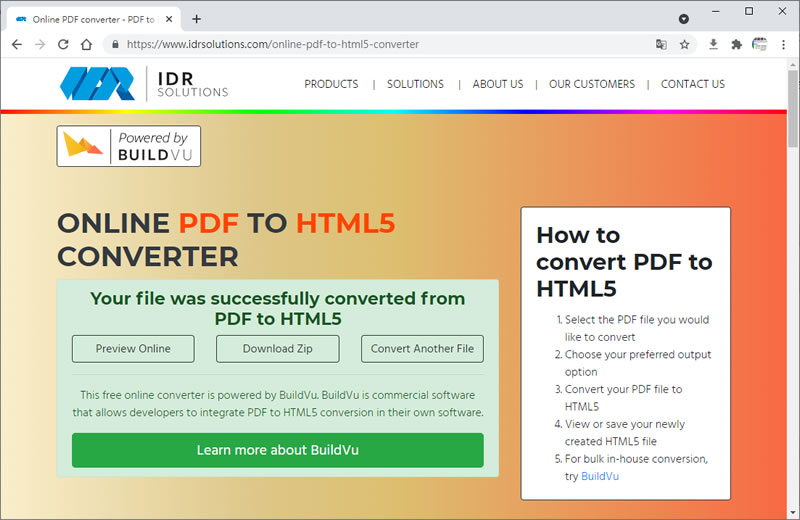 首頁線上工具檔案管理 IDR Solutions 將 PDF 文件轉成 HTML 5 如果需要將 PDF 檔案轉成更易於瀏覽器閱讀的格式,那 HTML5 將會是個不錯的選擇,ONLINE PDF TO HTML5 CONVERTER 為 IDR Solutions 這個網站旗下的一個服務,免費提供將 PDF 轉為 HTML5 的工具,讓需要將文件製作成 HTML 格式的使用者,免去多次施工的麻煩,就能輕鬆將文件搬上自家網站,以方便瀏覽者。 🔔 不錯過任何精彩! 立即訂閱我們的 LINE 官方帳號 每次發佈新文章時,您將會第一時間收到本站文章連結通知,輕鬆掌握最新資訊! 使用 LINE 追蹤文章更新 §相關文章,還可以參閱:VERT:開源本地端檔案格式轉換器,隱私優先的免費瀏覽器轉檔工具PageSplitty 線上 PDF 分割轉 JPG、PNG、WebP 圖工具,支援 5GB 大小的大檔案PixDuplicate:免上傳快速找出並刪除重複照片的免費線上工具Adapter:全方位影片、音檔及圖片格式轉換免費軟體,支援影片轉音檔與圖片,音檔及圖片格式互轉TextCompare 線上比較 Excel、PDF 及圖片,快速找出檔案不同之處 如何使用 IDR Solutions 將 PDF 文件轉成 HTML 5? 1.使用瀏覽器進入 IDR Solutions,按其指引步驟,首先點擊[ Choose File ]來選擇要轉換的 PDF 檔案。 2.接下來點擊[ Choose Output Option ],這裡我們選 Real Text,完成選擇後,按[ Convert ] 。 3.完成轉換後,可線上預覽,也可以直接下載。 4.按[ Preview Online ]可以直接看轉換後的效果。 5.解壓縮下載的檔案,可以直接搬到網站上。 IDR Solutions網站網址:https://www.idrsolutions.com/online-pdf-to-html5-converter/