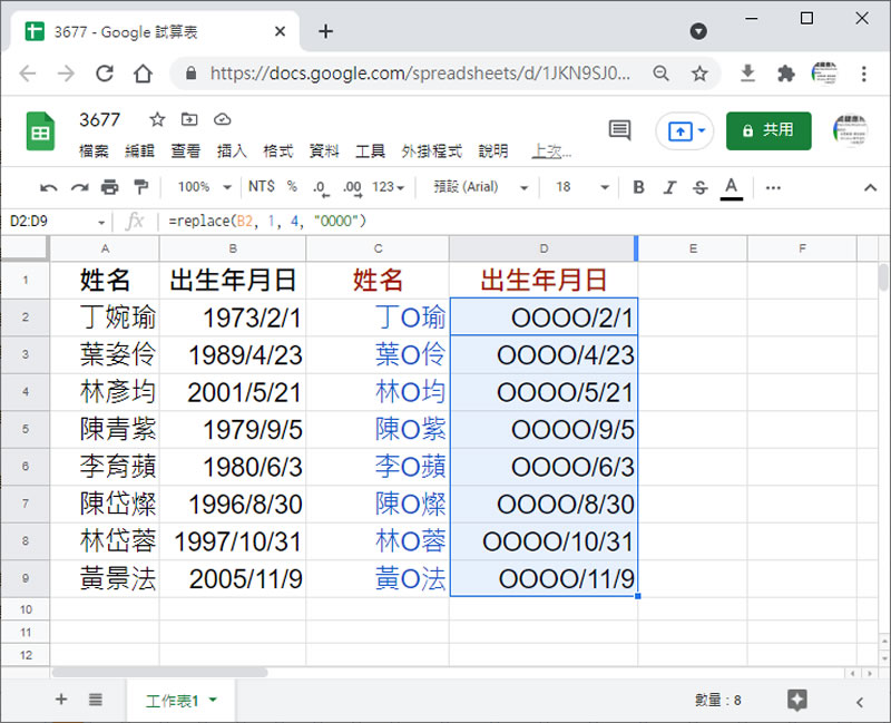 2.假設有如下的資料,我們想將姓名及其出生年月日做去識別化,例如陳大明 > 陳O明,OOOO/8/5。