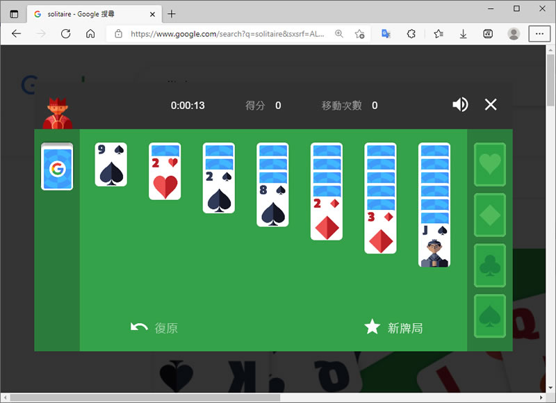 首頁操作技巧瀏覽器 如何在瀏覽器玩 Windows 經典的「接龍」遊戲? 從微軟 Windows 95 作業系統開始就有內建的小遊戲像是接龍、踩地雷等,直到 Windows 8 推出後,這些遊戲才消失,想要重溫經典的「接龍」遊戲嗎?現在只要經由 Google 搜尋引擎打入 solitaire 關鍵字,就可以在微軟的 Edge 或 Google Chrome 瀏覽器上玩「接龍」遊戲。 🔔 不錯過任何精彩! 立即訂閱我們的 LINE 官方帳號 每次發佈新文章時,您將會第一時間收到本站文章連結通知,輕鬆掌握最新資訊! 使用 LINE 追蹤文章更新 §相關文章,還可以參閱:如何在 Chrome 中顯示 / 隱藏 AI 模式按鈕?flags 設定教學Google AI 模式正式支援繁體中文:一次搞懂功能、應用與影響Edge 不用開側邊欄!網址列直接輸入提示詞就能 AI 生圖與搜圖Edge、Chrome 瀏覽器複製已開分頁到新分頁,這招你一定要學起來Edge Android 版新增底部網址列功能,來看怎麼設定 如何在 Edge 或 Chrome 瀏覽器玩「接龍」遊戲? 1.使用瀏覽器進入 Google 搜尋首頁,輸入 solitaire 關鍵字後,按[ Enter ]。 2.接下來按[ 玩遊戲 ]即可以進入遊戲。 3.選擇遊戲的困難度。 4.遊戲開始。