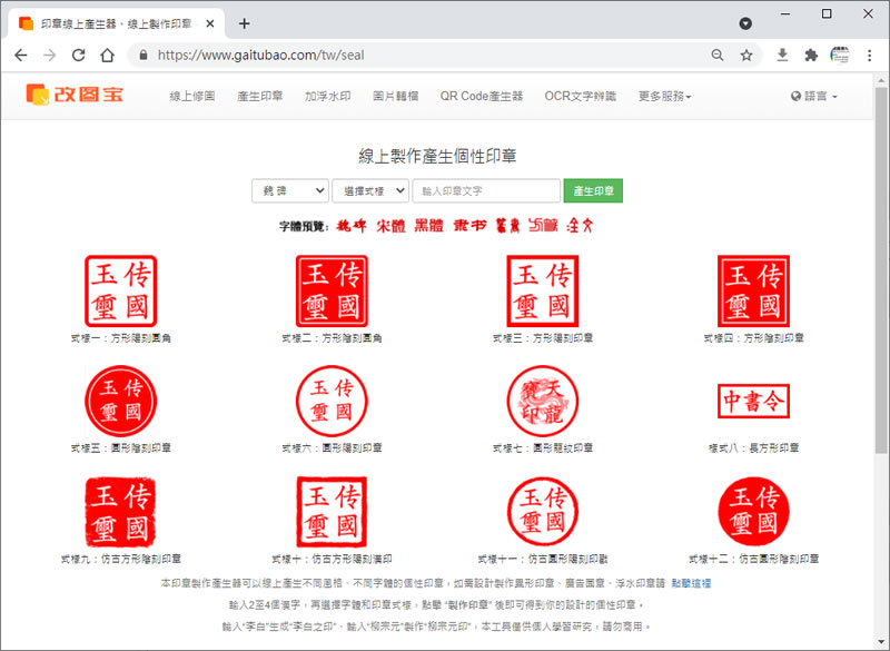 首頁免費素材圖像圖示 「改圖寶」免費線上印章圖檔產生器 個人印章多數用在實體文件上,其帶有法律效力,即便是儲存在電腦內的文件,多數也都是以圖檔來儲存,而印章圖檔呢?應該來說比較帶有裝飾性質,想要取得可自訂文字且是透明背景的印章圖檔,說實在也不用自己用圖片編輯軟體來製作,最簡單的方式就是利用線上印章圖檔產生器來製作,「改圖寶」這個網站免註冊就可以讓使用者輸入想要的文字,選好字型及所要的印章樣式,立刻就能產生背景透明的 PNG 圖檔,方便後續要應用的地方,相當方便。 🔔 不錯過任何精彩! 立即訂閱我們的 LINE 官方帳號 每次發佈新文章時,您將會第一時間收到本站文章連結通知,輕鬆掌握最新資訊! 使用 LINE 追蹤文章更新 §相關文章,還可以參閱:精心打造的等距美學:Isocons 免費圖示資源庫,CC BY 4.0 授權Map-It:日本地圖素材的免費寶庫,從全國到市町村一網打盡PICaboo! 日系可愛免費向量圖素材庫:設計師必收的創作寶庫GAHAG:日本免費圖庫新選擇,結合アハ體驗互動遊戲的創意素材平台illust STAMPO:日式風格的免費插圖素材網站 如何使用「改圖寶」印章產生器? 1.使用瀏覽器進入 「改圖寶」後,包含陰刻、陽刻在內共有 12種樣式可供使用者選擇。 2.使用者看好所要的樣式,便可以透過樣式上方的選擇器來選擇字形、樣式並輸入要產生印章內的文字後。 3.按[產生印章],稍後片刻,便可預覽及下載。 4.實際應用時,因其是背景透明的 PNG圖檔,後續應用也格外方便。 改圖寶網站網址:https://www.gaitubao.com/tw/seal