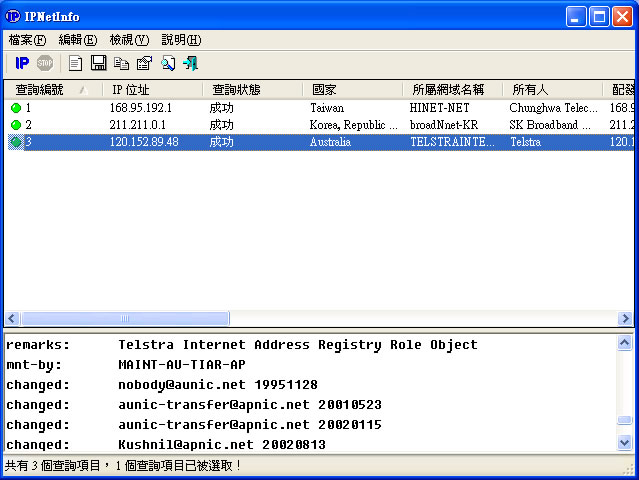首頁電腦軟體網路應用 IPNetInfo IP 資訊查詢工具 IPNetInfo 是一款能夠利用 IP 位址來查詢該位址的擁有者為何人的IP訊息查詢工具,你可以輸入一個或貼上數個IP,它就會自動連上WHOIS伺服器去查詢,回報的資訊包括:IP所有者、IP位址範圍、聯絡人訊息...等等,甚至你把郵件的表頭複製貼上,它還會自動去一堆文字中判斷哪些是IP。 🔔 不錯過任何精彩! 立即訂閱我們的 LINE 官方帳號 每次發佈新文章時,您將會第一時間收到本站文章連結通知,輕鬆掌握最新資訊! 使用 LINE 追蹤文章更新 §相關文章,還可以參閱:Bright VPN 提供覆蓋全球60多個位置的免費 VPN服務WhoisThisDomain 網域名稱註冊資料免費查詢工具PingInfoView 可自訂時間 PING 自訂的 IP 或網域並發出通知Wireless Network Watcher 找出有哪些裝置正在連你的無線網路FileZilla Client 免費 FTP 傳檔軟體(繁體中文 免安裝版) 如何使用IPNetInfo來查詢IP? 1.將檔案下載回來解壓縮後(如果你需要中文版的話,請一並下載繁體中文語言檔,解壓縮後請放置在主程式的同一目錄) 2.執行主程式,在紅色框中輸入你要查詢的IP地址或網域名稱,可以輸入多個,如果需要獎網域名稱自動轉成IP去解析,請勾選將主機名稱轉換為 IP 位址的功能,輸入完成後按確定 3.查詢後的結果 IPNetInfo版本:1.95語言:英文性質:免費適用:Windows官方網站:https://www.nirsoft.net/utils/ipnetinfo.html下載:按我下載