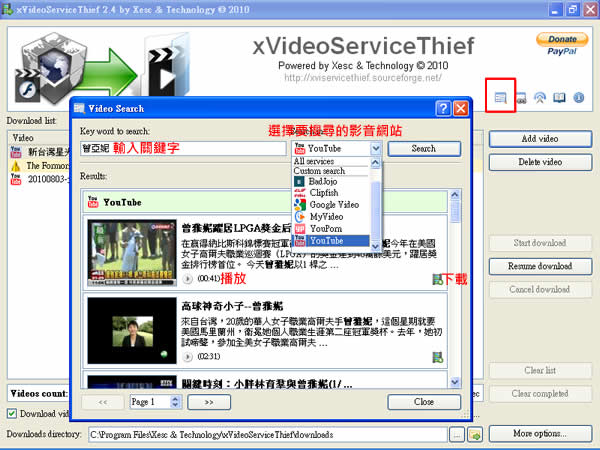 首頁電腦軟體上傳下載 xVideoServiceThief 支援影音網站搜尋及下載的免費應用程式 xVideoServiceThief 是一套支援 HTTP 及 RTMP 通訊協定的免費影音網站影片下載軟體,可直接輸入影音網址便可下載或使用內建搜尋功能輸入關鍵字搜尋並下載,且抓下來的影片,還能直接轉成不同的影音格式檔。 🔔 不錯過任何精彩! 立即訂閱我們的 LINE 官方帳號 每次發佈新文章時,您將會第一時間收到本站文章連結通知,輕鬆掌握最新資訊! 使用 LINE 追蹤文章更新 §相關文章,還可以參閱:ArrowDL 全平台下載利器:輕鬆批量下載 YouTube、BT、FB與多站串流影片YouTubePlaylistDownloader 支援播放清單與頻道的 YouTube 影片下載工具,還能轉換格式Parabolic 讓 yt-dlp 更好用的免費影音下載工具,支援上千個網站的影音下載Hasleo Windows ISO Downloader 幫你從微軟網站下載原版 Windows ISO 檔XMusicDownloader 從音樂網站搜尋並下載歌曲的免費應用程式 如何使用 xVideoServiceThief? 1.完成安裝,開啟 xVideoServiceThief 後,如果已有 xVideoServiceThief 所支援的影片網址,可以點擊[ Add video ]來輸入影片網址,點擊[ OK ]便會自動下載。 2.如果要使用搜尋影片功能,點擊右上方的[ Search video ],在所出現的視窗中輸入搜尋的關鍵字,若只想在特定的影音網站進行搜尋,可在關鍵字後的 Search in 下拉篩選,設定好之後,點擊[Search],便會列出所搜尋到的影片,在找到的影片下方,有播放及下載按鈕。 3.若要對 xVideoServiceThief 進行設定,可點擊主介面的右下角[More options]便會開啟設定視窗,包含語言、影片存放位置、輸出的影音格式...等。 xVideoServiceThief版本:2.5.2語言:英文性質:免費適用:Windows官方網站:https://sourceforge.net/projects/xviservicethief/下載:按我下載