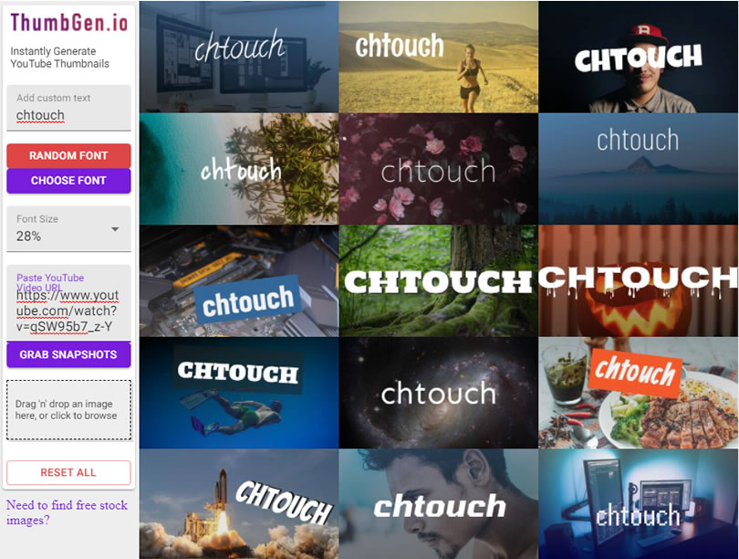 1.使用瀏覽器進入 ThumbGen.io 網站後,可以看到許多範例圖片,我們可以在圖片左側欄,選擇所要的英文字型、字型大小與輸入 YouTube 影片網址。