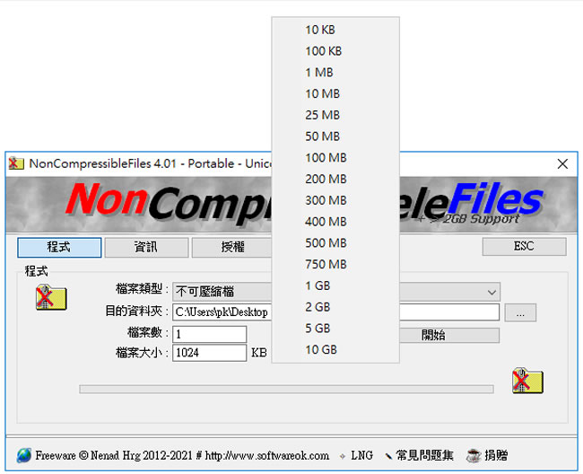 首頁電腦軟體生產力工具 NonCompressibleFiles 可用來產生自訂大小檔案的免費軟體 要找期望的檔案大小用於測試,通常都不會剛剛好,與其找來找去,還不如自己建立一個可由自己指定大小的檔案,該如何產生呢?除了可以透過 Windows 內建的 fsutil file createnew 指令之外,我們也可以利用 NonCompressibleFiles 這個免費的應用程式來產生,透過程式介面,使用者可以建立可壓縮與不可壓縮的檔案,且可以一次產生一個或多個自訂大小的檔案。 🔔 不錯過任何精彩! 立即訂閱我們的 LINE 官方帳號 每次發佈新文章時,您將會第一時間收到本站文章連結通知,輕鬆掌握最新資訊! 使用 LINE 追蹤文章更新 §相關文章,還可以參閱:AingDesk:一鍵安裝 Ollama AI 模型管理器,讓 LLaMA、DeepSeek 在本機電腦上運行Arc 瀏覽器正式登陸 Windows 11,開啟全新瀏覽體驗!Norton Secure Browser 使用 Chromium 核心的瀏覽器,有廣告封鎖和隱私保護功能BingGPT 桌面應用程式,讓你不用 Edge 也能用 Bing 聊天機器人SlippyClerk 數字、英文字母有序字串產生器 可自訂前後綴字詞 如何使用 NonCompressibleFiles? 1.解壓縮下載的免安裝版後,執行 NonCompressibleFiles_p.exe 便可以開啟,開啟後,按[ 我接受協議 ] 。 2.切換到[ 程式 ]頁籤,選擇檔案類型、目的地資料夾及所要產生的檔案數量。 3.輸入檔案大小,其單位採 KB計算,也可以按 KB 後方的 ...圖示按鈕來選擇。 4.按[ 開始 ]來產生檔案。 NonCompressibleFiles版本:4.55語言:中、英文性質:免費適用:Windows官方網站:https://www.softwareok.com/?Download=NonCompressibleFiles下載: Windows 32bit 安裝版按我下載 | 免安裝版按我下載 Windows 64bit 安裝版按我下載 | 免安裝版按我下載