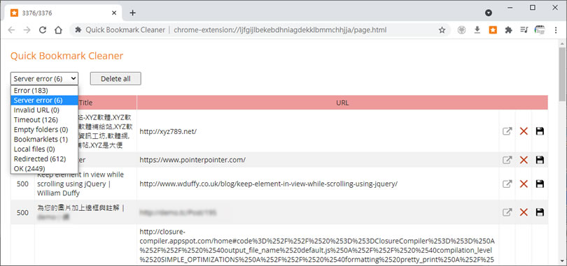 首頁瀏覽器擴充功能網頁瀏覽 Quick Bookmark Cleaner 快速找出瀏覽器內已失效的書籤 - 瀏覽器擴充功能 Chrome、Edge 瀏覽器有提供書籤、我的最愛功能,可以讓使用者將有參考價值的網頁記錄起來,便於日後可透過書籤再次瀏覽,但隨著時間的累積,書籤數量也越來越多,如果沒有隨時整理,再次透過書籤要瀏覽該網頁時,常有失效的問題,該如何快速找出這些已失效的書籤呢?Quick Bookmark Cleaner 是個瀏覽器擴充功能,運行該擴充功能後,會掃描瀏覽器內的所有書籤,檢查其鏈結狀況,並詳列出錯誤、失效、重導向...等各種狀況,提供給使用者參考並採取進一步的操作。 🔔 不錯過任何精彩! 立即訂閱我們的 LINE 官方帳號 每次發佈新文章時,您將會第一時間收到本站文章連結通知,輕鬆掌握最新資訊! 使用 LINE 追蹤文章更新 §相關文章,還可以參閱:Font Finder & Style Detector 網頁字型搜尋與樣式偵測器,免費瀏覽器擴充功能MarkX 將網頁所選文字內容儲存成書籤,提供關鍵字搜尋功能U-Eyes 移動設備瀏覽網站模擬器,可擷取網頁成圖片與錄製螢幕Live CSS Tester 在任何網頁注入 CSS 進行即時測試Quick History 以網站角度快速檢視該網站的瀏覽紀錄(瀏覽器擴充功能) 如何使用 Quick Bookmark Cleaner? 1.進入到 Quick Bookmark Cleaner 擴充功能頁面後,按[ 加到 Chrome ]按鈕,並依提示步驟操作即可以完成安裝( Edge 瀏覽器的安裝方式是一樣的 )。 2.完成安裝,可以看到提示及 Quick Bookmark Cleaner 擴充功能按鈕。 3.點擊剛剛安裝完成的 Quick Bookmark Cleaner 擴充功能按鈕,會出現參數頁面,根據目前網路狀態,可適時的調整 Request timeout (s) 值,點擊[ Start ]開始掃描。 4.掃描過程會顯示進度及目前掃苗的網址。 5.完成掃描,會區分出多種書籤目前所處狀態,使用者可以根據狀態,利用網址後的功能按鈕進行操作,也可以按[ Delete all ]將狀況內的書籤列表全部刪除。 Quick Bookmark Cleaner語言:英文性質:免費官方網站:https://chrome.google.com/webstore/detail/quick-bookmark-cleaner/ljfgijlbekebdhniagdekklbmmchhjja/related