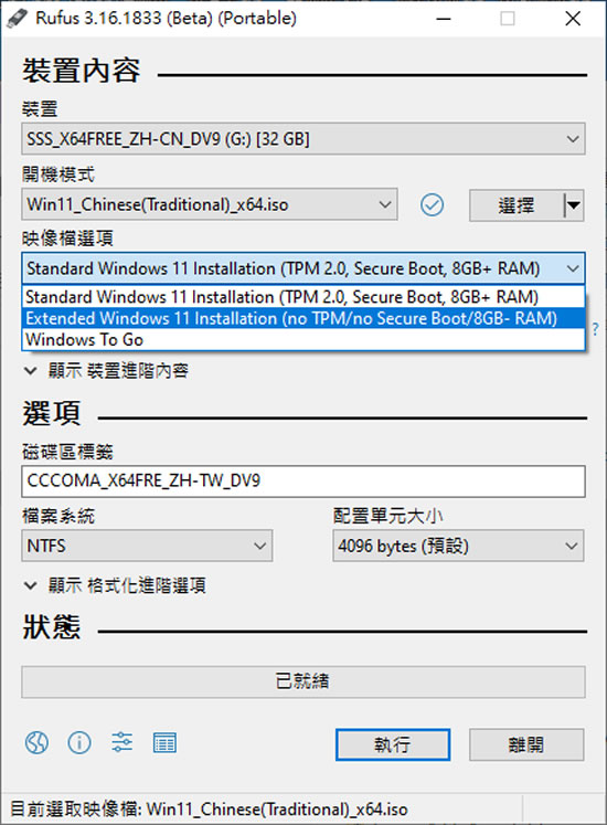 首頁電腦軟體系統應用 如何利用 Rufus 製作可繞過 TPM 限制的 Windows 11 安裝程式? 微軟 Windows 11 已於 10月 5日推出正式版,對 Windows 10用戶來說,只要硬體有 TPM 2.0 與八代 CPU以上大致上都可以免費升級,但很多機器都卡在 TPM 2.0的這個限制,網路上也有教透過「登錄編輯程式」修改「機碼」來繞過檢測項目的安裝方式,但這對很多人來說,還是過於複雜,而最簡單的方式就是直接透過最新版的 rufus 直接製作可避開 Windows 11 的 TPM、安全啟動和 RAM 的限制要求,讓安裝 Windows 11 也可以很簡單。 🔔 不錯過任何精彩! 立即訂閱我們的 LINE 官方帳號 每次發佈新文章時,您將會第一時間收到本站文章連結通知,輕鬆掌握最新資訊! 使用 LINE 追蹤文章更新 §相關文章,還可以參閱:CatLock:可鎖定鍵盤的 Windows 應用程式,防止寵物意外觸碰Zen Ad blocker 瀏覽器與應用程式均適用的廣告攔截器,免費且開放原始碼TimVer 一站式顯示 Windows 版本及電腦硬體相關訊息的工具「微軟電腦管家」內含開機啟動項目管理、儲存空間最佳化等免費工具 全方位提升電腦效能Windows Startup Timer 測量 Windows 從開機到完全啟動所需時間 如何利用 Rufus 製作可繞過 TPM 2.0 限制的 Windows 11 安裝程式? 1.先準備我們會使用到的 Windows 11 與 rufus-3.16_BETA2.exe 檔案。 Windows 11 可以在微軟官網,選擇下載 Windows 11 磁碟映像 (ISO)。 Rufus 則需選擇 rufus-3.16_BETA2.exe 下載。 2.執行 rufus-3.16_BETA2.exe,在[ 開機模式 ]按[ 選擇] 選擇剛剛所下載的 Win11_Chinese(Traditional)_x64.iso 檔案。 3.在[ 映像檔選項 ]處選擇[ Extended Windows 11 Installation(no TPM/no Secure Boot/8GB-RAM)]選項。 4.按[ 執行 ]開始製作。 5.完成後,安裝 Windows 11就可以避開 TPM 的要求。 rufus版本:3.16 BETA2語言:中文性質:免費適用:Windows官方網站:https://rufus.ie/zh_TW/下載:rufus-3.16_BETA2.exe