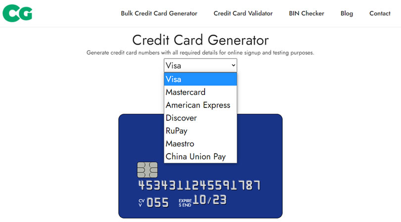 首頁線上工具生活資訊 Credit Card Generator 含 CVV 檢查碼在內的信用卡卡號產生器 電子商務盛行,連帶線上支付相關需求也增加,對商務網站來說金流就成為不可避免的問題,而串接後的測試,如果是需要使用信用卡的部分,該到哪裡取得相關的信用卡號用於測試呢?Credit Card Generator 這個網站可以來協助我們取得包含 Visa、MasterCard、AMEX、Discover、RuPay、Maestro 和中國銀聯卡在內的七種卡號,並生成該卡有關發行人、到期月份、到期年份、到期(到期月/到期年)、信用卡檢查碼、姓名、地址、國家、郵政編碼等,而這些相關訊息還可以轉成JSON、XML 及 CSV 檔案格式,這對批次測試就方便多了,至於這些虛擬出的信用卡卡號,可不可以用在正式的註冊程序內,該網站也有特別提出說明說如果是需要驗證預付款的信用卡註冊流程,是無法成功的。 🔔 不錯過任何精彩! 立即訂閱我們的 LINE 官方帳號 每次發佈新文章時,您將會第一時間收到本站文章連結通知,輕鬆掌握最新資訊! 使用 LINE 追蹤文章更新 §相關文章,還可以參閱:459 萬人搶 60 萬份!運動幣中獎號碼公布,快查你的身分證尾數都馬一起GO!LINE GO新年優惠最高拿$800優惠券,還有一個月乘車金等你抽過年搭高鐵自由座要排多久?看LINE就知道 台灣高鐵×LINE TODAY推出春節限定燈號預估服務2026春節看診不煩惱!健保快易通一鍵查詢過年門診資訊2月 Disney+ 不容錯過!韓劇《在你燦爛的季節》、Pixar 原創動畫、漫威英雄一次滿足 如何使用 Credit Card Generator 產生信用卡卡號? 1.使用瀏覽器進入 Credit Card Generator 網站,如果需要批次產生,可以按[ Bulk Credit Card Generator ]。 2.挑選所要的信用卡種類。 3.以 MasterCard 來說,生成後會產生產生一張 MasterCard 信用卡,卡面上會有信用卡卡號(16 碼)、安全碼 CVV 和過期日期(月份和年份)。 4.該張卡片的完整資料可透過其下方的 JSON、XML 或 CSV 取得格式化後的資料,點擊右上角的複製可以將所有資訊複製下來使用。 Credit Card Generator網站網址:https://cardgenerator.org/
