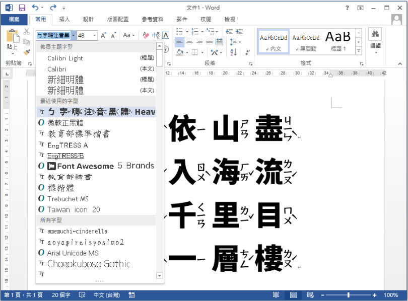 3.完成安裝,開啟文書編輯應用程式,選擇剛剛所安裝的字形,便可以打出含注音符號的國字。