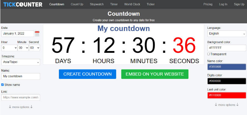 首頁線上工具網頁瀏覽 Countdown Timer 在網頁上放個倒數計時器 辦活動的網頁,如果可以適時的放上倒數計時器,藉以提醒有興趣的網頁訪問者,絕對有加分的作用,那麼要放到網頁的倒數計時器該如何製作呢?這就不用傷腦筋了,透過 TickCounter 網站旗下的 Countdown Timer 服務,便可以輕鬆完成,使用者除了可以自訂倒數計時器的名稱、終止時間及顏色樣式,還能直接產生嵌入網頁的程式碼,更棒的是該程式碼還支援自適應網頁( RWD,Responsive web design ),讓使用者即便是在行動裝置上也能瀏覽。 🔔 不錯過任何精彩! 立即訂閱我們的 LINE 官方帳號 每次發佈新文章時,您將會第一時間收到本站文章連結通知,輕鬆掌握最新資訊! 使用 LINE 追蹤文章更新 §相關文章,還可以參閱:Chrome 推出 Auto Browse:讓 AI 自動訂機票、找房子、填表單,還能即時改圖Google 搜尋『67』會發生什麼事?網友實測驚呼:螢幕活了!Google 2025 台灣年度搜尋榜:地震、普發現金、Gemini,我們都在找什麼?ChatGPT Atlas 瀏覽器問世:三大 AI 功能顛覆你的上網方式Microsoft Rewards 點數全自動狂賺法,一鍵設定、天天進帳! 如何使用「Countdown Timer - TickCounter」在網頁放入倒數計時器? 1.使用瀏覽器進入 Countdown Timer - TickCounter 網站,預設就會有個倒數計時器。 2.我們可以透過兩側的參數設置改變該倒數計時器的樣式,如果要支援自適應網頁( RWD,Responsive web design ),可勾選右下角[ Responsive design ] 3.完成設計,按[ CREAT COUNTDOWN ]按鈕,可先預覽,滿意後,可按[ Embed ]來取得嵌入網頁的程式碼。 4.複製程式碼放到網頁想要呈現倒數計器的地方就完成了,不論是在電腦或行動設備上都可以自動適應。 關鍵應用Countdown Countdown Timer - TickCounter網站網址:https://www.tickcounter.com/