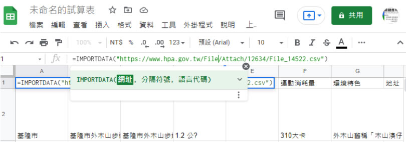 首頁線上工具網頁瀏覽 [ Google 試算表 ]如何匯入網頁提供的 CSV 檔案資料? .csv (逗號分隔值)或 .tsv (Tab 分隔值)都是一種以純文字形式儲存表格資料的檔案格式,其常見的應用便是在資料轉移上,以政府開放資料平臺為例,在內的資料集列表就有很多同時提供 CSV 檔案格式讓用戶選擇,要使用這些資料集最簡單的方式就是透過「 Excel」或是「Google 試算表」直接將 CSV 檔案內的資料匯入到試算表中,以「Google 試算表」為例,只要使用[ IMPORTDATA ]函數,就可以直接到網頁抓取 CSV 檔案,並將資料解析到試算表內,讓使用者不必傷腦筋要如何匯入資料,而是將時間花在要如何呈現這些資料上。 🔔 不錯過任何精彩! 立即訂閱我們的 LINE 官方帳號 每次發佈新文章時,您將會第一時間收到本站文章連結通知,輕鬆掌握最新資訊! 使用 LINE 追蹤文章更新 §相關文章,還可以參閱:Chrome 推出 Auto Browse:讓 AI 自動訂機票、找房子、填表單,還能即時改圖Google 搜尋『67』會發生什麼事?網友實測驚呼:螢幕活了!Google 2025 台灣年度搜尋榜:地震、普發現金、Gemini,我們都在找什麼?ChatGPT Atlas 瀏覽器問世:三大 AI 功能顛覆你的上網方式Microsoft Rewards 點數全自動狂賺法,一鍵設定、天天進帳! [ Google 試算表 ]如何匯入網頁提供的 CSV 檔案資料? 1.先來看看 Google 所提供 IMPORTDATA 函數用法示範,就是 IMPORTDATA( 檔案網址 )。 2.到 政府開放資料平臺上,以社區健走步道 CSV 檔案來練習,在資料資源下載網址欄位處按[ 檢視資料 ]取得該檔案的網址。 3.取得 CSV 檔案網址後,在 A1 儲存格處,輸入下列指令後,按鍵盤 Enter 鍵,稍後,便會將解析完成的資料匯入到試算表內。 =IMPORTDATA("https://www.hpa.gov.tw/File/Attach/12634/File_14522.csv") 4.適時的加入篩選器,便可快速篩選出想要的資料。 ※ 按我可取得上述 Google 試算表檔案