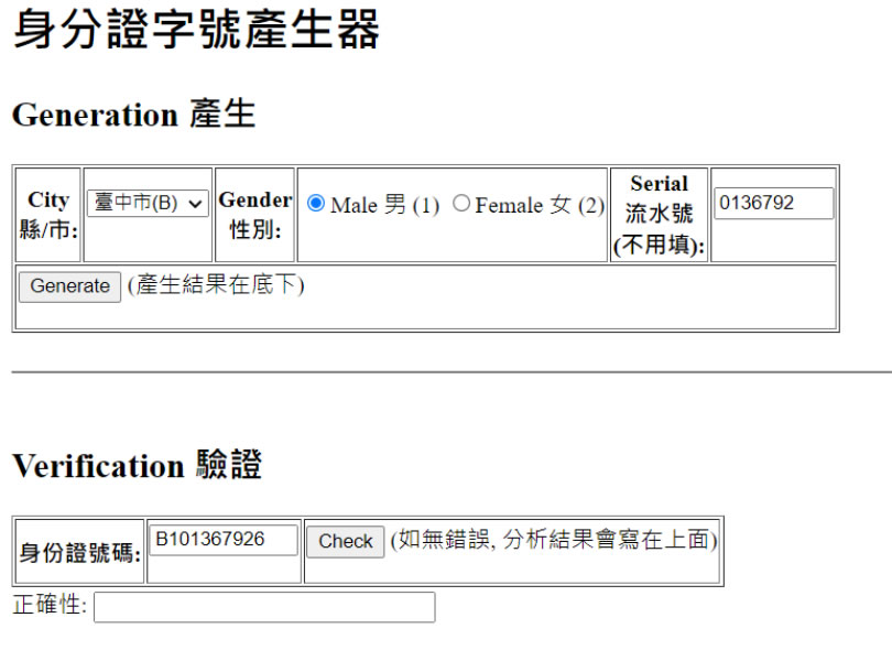 首頁線上工具生活資訊 ROC ID Generator 台灣身份證字號線上產生器 大家都知道,身分證上的資料除了有相片、姓名、出生年月日...等資訊外,還有個身份證字號,這個字號並不是隨機產生也不是按出生順序來編碼,而是遵循一套完整的編碼規則,如果程式測試需要多個身分證字號數據用以驗證身分證號碼輸入的正確性,可以試試這個「身分證字號產生器」網站,該網站提供產生與驗證兩項功能,在身分證號碼產生時只要選擇縣市、性別,就可以產生一組身分證字號供測試使用,另外,取得的身分證號碼正確與否也可以利用該網站來驗證。 🔔 不錯過任何精彩! 立即訂閱我們的 LINE 官方帳號 每次發佈新文章時,您將會第一時間收到本站文章連結通知,輕鬆掌握最新資訊! 使用 LINE 追蹤文章更新 §相關文章,還可以參閱:459 萬人搶 60 萬份!運動幣中獎號碼公布,快查你的身分證尾數都馬一起GO!LINE GO新年優惠最高拿$800優惠券,還有一個月乘車金等你抽過年搭高鐵自由座要排多久?看LINE就知道 台灣高鐵×LINE TODAY推出春節限定燈號預估服務2026春節看診不煩惱!健保快易通一鍵查詢過年門診資訊2月 Disney+ 不容錯過!韓劇《在你燦爛的季節》、Pixar 原創動畫、漫威英雄一次滿足 如何使用「身分證字號產生器」? 1.使用瀏覽器進入 「身分證字號產生器」網站,選擇縣市、性別(男生、女生),然後就可以點擊「 Generate」產生身分證字號。 2.選擇好後,按[ Generate ]就會產生一組可用於測試用的身分證字號。 3.若有想要驗證的身分證字號,也可以在 Verification 驗證區塊處輸入,再按[ Check ]來驗證。 ROC ID Generator 台灣身份證字號產生器網站網址:https://www.csie.ntu.edu.tw/~b90057/use/ROCid.html